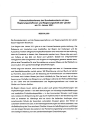 Videoschaltkonferenz der Bundeskanzlerin mit den Regierungschefinnen und Regierungschefs der Länder am 19. Januar 2021 BESCHLUSS Die Bundeskanzlerin und die Regierungschefinnen und Regierungschefs der Länder fassen folgenden Beschluss: Zum Beginn des Jahres 2021 gibt es in der Corona-Pandemie große Hoffnung. Die Zulassung von inzwischen zwei Impfstoffen, der Beginn der Impfungen und die Aussicht auf weitere erfolgreiche Impfstoffkandidaten sind verbunden mit der Hoffnung, dass die Pandemie in diesem Jahr überwunden werden kann. Genau dies war auch von Anfang an das Ziel von Bund und Ländern: Sobald bei entsprechender Verfügbarkeit allen Bürgerinnen und Bürgern ein Impfangebot gemacht werden kann, gibt es eine Perspektive für eine Normalisierung unseres Alltags und die Rückkehr zu einem Leben ohne pandemiebedingte Einschränkungen. Ferner zeigt sich deutlich, dass die Beschränkungen seit dem 16. Dezember wirken und Neuinfektionszahlen zurück gehen. Mit Erleichterung nehmen Bund und Länder zur Kenntnis, dass damit auch die Belastung der Krankenhäuser und Intensivstation auf immer noch hohem Niveau jetzt leicht rückläufig ist. Das hat auch viel mit dem besonnenen Verhalten der Bürgerinnen und Bürger während der Weihnachtsfeiertage zu tun. Dafür sind die Bundeskanzlerin und Regierungschefinnen und -chefs der Länder von Herzen dankbar. Zu Beginn dieses neuen Jahres gibt es aber auch große Herausforderungen: Die Impfstoffmengen werden - bei allen Bemühungen um frühzeitige Impfstofflieferungen und zusätzliche Produktionskapazitäten — in den kommenden Monaten noch knapp sein, sodass eine Entspannung der Lage durch Impfimmunität in der Bevölkerung noch nicht zu erwarten ist. Allerdings wird es durch die laufenden Impfungen einen zunehmenden Schutz der besonders vulnerablen Gruppen geben. Der Winter ist außerdem ohnehin eine Zeit, in der Atemwegserkrankungen sich leicht ausbreiten, was die Bekämpfung des Virus erschwert. Darüber hinaus sind alle Bürgerinnen und Bürger von den langen Monaten des Lebens in der Pandemie angestrengt und wünschen sich eine baldige Entlastung von den pandemiebedingten Einschränkungen.