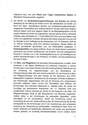 Ergänzend dazu wird eine Pflicht zum Tragen medizinischer Masken im öffentlichen Personenverkehr eingeführt. Der Betrieb von Kinderbetreuungseinrichtungen und Schulen hat höchste Bedeutung für die Bildung der Kinder und für die Vereinbarkeit von Familie und Beruf der Eltern. Geschlossene Schulen und Kinderbetreuungseinrichtungen, ausgesetzte Präsenzpflicht bzw. Distanzunterricht in Schulen über einen längeren Zeitraum bleiben nicht ohne negative Folgen für die Bildungsbiographien und die soziale Teilhabe der Kinder und Jugendlichen. Dennoch gibt es ernst zu nehmende Hinweise, dass die Mutation B.1.1.7 des SARS-CoV2-Virus sich auch stärker unter Kinder und Jugendlichen verbreitet, als das bei dem bisher bekannten Virus der Fall ist. Deshalb ist eine Verlängerung des Beschlusses vom 13. Dezember 2020 bis 14. Februar notwendig, sowie eine restriktive Umsetzung. Danach bleiben die Schulen grundsätzlich geschlossen bzw. die Präsenzpflicht ausgesetzt. In Kindertagesstätten wird analog verfahren. Bund und Länder danken ausdrücklich Lehrerinnen und Lehrern, Erzieherinnen und Erziehern und dem pädagogischen Personal in Schulen und in der Kindertagesbetreuung für die Bewältigung der großen Herausforderungen in der Pandemie. Ihr Arbeits- und Gesundheitsschutz hat hohe Priorität. Für Alten- und Pflegeheime sind besondere Schutzmaßnahmen zu treffen. Hohe Inzidenzen in der älteren Bevölkerung und zahlreiche Ausbrüche in solchen Einrichtungen in den letzten Wochen trotz aller bereits getroffenen Maßnahmen wie der Umsetzung von Hygienekonzepten und der Bereitstellung von Schutzausrüstung haben dies noch einmal verdeutlicht. Für das Personal in Alten- und Pflegeeinrichtungen wird beim Kontakt mit den Bewohnern eine FFP2- Maskenpflicht vorgesehen. Mindestens bis die Impfungen mit beiden Impfdosen in den Einrichtungen abgeschlossen sind und die Personen eine entsprechende Immunität aufgebaut haben, kommt den Schnelltests beim Betreten der Einrichtungen eine besondere Bedeutung zu. Deshalb haben die Länder auf Grundlage des gemeinsamen Beschlusses vom 13. Dezember 2020 eine verpflichtende Testung mehrmals pro Woche für das Personal in den Alten- und Pflegeeinrichtungen sowie für alle Besucherinnen und Besucher angeordnet. Vielfach fehlen in den Einrichtungen die personellen Kapazitäten, solche Schnelltests vor Ort durchzuführen, obwohl die Finanzierung sowohl der Anschaffung als auch der Testdurchführung über die Testverordnung des Bundes sichergestellt ist. Die Einrichtungen sind in der Verantwortung, eine umfassende Umsetzung der Testanordnung sicherzustellen. Unterstützend haben Bund und Länder aufbauend auf bestehenden Maßnahmen der Länder eine gemeinsame Initiative gestartet, um kurzfristig Bundeswehrsoldaten und im zweiten Schritt
