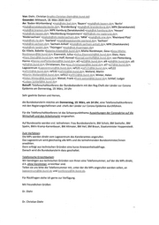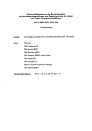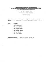 Telefonschaltkonferenz der Bundeskanzlerin mit den Regierungschefinnen und Regierungschefs der Länder zum Thema Coronavirus-Infektionen am 19. März 2020, 14.00 Uhr -Teilnehmerliste- Länder: Die Regierungschefinnen und Regierungschefs aller 16 Länder. Bund: Chef BK StM Hoppenstedt BM Scholz (BMF) BM Seehofer (BMI) BM Altmaier (BMWi) BM Heil (BMAS) BM Spahn (BMG) stille Zuhörer BKAmt: AL’in 1, AL’in 3, GL 12, Ref. 122