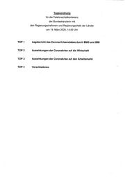 TOP 1 TOP 2 TOP 3 TOP 4 Tagesordnung für die Telefonschaltkonferenz der Bundeskanzlerin mit den Regierungschefinnen und Regierungschefs der Länder am 19. März 2020, 14.00 Uhr Lagebericht des Corona-Krisenstabes durch BMG und BMI Auswirkungen der Coronakrise auf die Wirtschaft Auswirkungen der Coronakrise auf den Arbeitsmarkt Verschiedenes