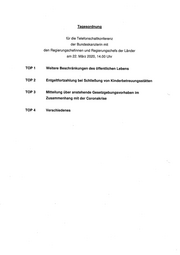 Tagesordnung für die Telefonschaltkonferenz der Bundeskanzlerin mit den Regierungschefinnen und Regierungschefs der Länder am 22. März 2020, 14.00 Uhr TOP 1 Weitere Beschränkungen des öffentlichen Lebens TOP 2 Entgeltfortzahlung bei Schließung von Kinderbetreuungsstätten TOP 3 Mitteilung über anstehende Gesetzgebungsvorhaben im Zusammenhang mit der Coronakrise TOP 4 Verschiedenes