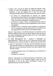 b. Besteht in dem Land oder der Region eine stabile oder sinkende 7-Tage- Inzidenz von unter 100 Neuinfektionen pro 100.000 Einwohnerinnen und Einwohnern, so kann das jeweilige Land 14 Tage nach dem dfritten Öffnungsschritt folgende weitere Öffnungen landesweit oder regional vorsehen: «e Die Öffnung der Außengastronomie für Besucher mit vorheriger Terminbuchung mit Dokumentation für die Kontaktnachverfolgung; Sitzen an einem Tisch Personen aus mehreren Hausständen ist ein tagesaktueller COVID-19 Schnell- oder Selbsttest der Tischgäste erforderlich. e die Öffnung von Theatern, Konzert- und Opernhäusern sowie Kinos für Besucherinnen und Besuchern mit einem tagesaktuellen COVID-19 Schnell- oder Selbsttest; e kontaktfreier Sport im Innenbereich sowie Kontaktsport im Außenbereich unter der Voraussetzung, dass alle Teilnehmerinnen und Teilnehmer über einen tagesaktuellen COVID-19 Schnell- oder Selbsttest verfügen. Steigt die 7-Tage-Inzidenz pro 100.000 Einwohnerinnen und Einwohner an drei aufeinander folgenden Tagen in dem Land oder der Region auf über 100, treten ab dem zweiten darauffolgenden Werktag die Regeln, die bis zum 7. März gegolten haben, wieder in Kraft (Notbremse). Der fünfte Öffnungsschritt kann - wiederum in Abhängigkeit vom Infektionsgeschehen - erfolgen, wenn sich die 7-Tage-Inzidenz nach dem vierten Öffnungsschritt in dem Land oder der Region 14 Tage lang nicht verschlechtert hat: a. Wenn die 7-Tage-Inzidenz 14 Tage lang nach dem Inkrafttreten des vierten Öffnungsschritts landesweit oder regional stabil bei unter 50 Neuinfektionen bleibt, kann das Land entsprechend landesweit oder regional folgende weitere Öffnungen vorsehen: e Freizeitveranstaltungen mit bis zu 50 Teilnehmerinnen und Teilnehmern im Außenbereich; e Kontaktsport in Innenräumen Steigt die 7-Tage-Inzidenz pro 100.000 Einwohnerinnen und Einwohner in dem Land oder der Region an drei aufeinander folgenden Tagen auf über 50 Neuinfektionen an, wird ab dem zweiten darauffolgenden Werktag in den geöffneten Bereichen nach Ziffer 8b verfahren.