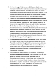 . Mit einem einmaligen Kinderbonus von 300 Euro pro Kind für jedes kindergeldberechtigtes Kind werden die besonders von den Einschränkungen betroffenen Familien unterstützt. Dieser Bonus wird mit dem steuerlichen Kinderfreibetrag vergleichbar dem Kindergeld verrechnet. Er wird nicht auf die Grundsicherung angerechnet. Der Länder- und Kommunalanteil an diesem einmaligen Bonus wird den Ländern vom Bund nachträglich erstattet. . Der Bund hat die Auflage eines Überbrückungshilfeprogramms für kleine und mittelständische Unternehmen, die ihren Geschäftsbetrieb im Zuge der Corona-Krise ganz oder zu wesentlichen Teilen einstellen mussten, für die Monate Juni bis August 2020 in Höhe von bis zu 25 Mrd. Euro beschlossen. Bund und Länder streben den kurzfristigen Abschluss einer Verwaltungsvereinbarung an, damit die Überbrückungshilfen durch kleine und mittelständische Unternehmen so schnell wie möglich beantragt und ihnen ausgezahlt werden können, um zu ihrer Existenzsicherung beizutragen. Die Antragstellung soll nur digital erfolgen können und verpflichtend über Steuerberater und Wirtschaftsprüfer abgewickelt werden. Die Länder stellen die zügige Bearbeitung und Auszahlung sicher. . Zur Stabilisierung gemeinnütziger Organisationen wird der Bund für das Jahr 2020 im Rahmen eines Kredit-Sonderprogramms über die KfW zu 80 Prozent die erforderliche Haftungsfreistellung entsprechender zu fördernden Maßnahmen der landeseigenen Förderinstitute sicherstellen. Die Länder werden prüfen, ob sie mit eigenen Mitteln eine Haftungsfreistellung bis zu insgesamt 100 Prozent für Programme zugunsten gemeinnütziger Organisationen ermöglichen. . Den pauschalierten hälftigen Ausgleich für die aktuellen krisenbedingten Ausfälle der Gewerbesteuereinnahmen in den Kommunen durch den Bund werden die Länder so an die Kommunen weitergeben, dass alle Gebietskörperschaften orientiert an ihrem Ausfall davon profitieren. Die Länder werden die weitere Hälfte der Ausfälle mit eigenen Mitteln leisten. Darüber hinaus begrüßen die Länder die Entlastung der Kommunen über die erhöhte Beteiligung des Bundes an den Kosten der Unterkunft. Die notwendige Änderung des Grundgesetzes wird unterstützt. |