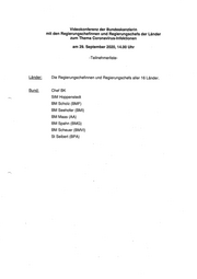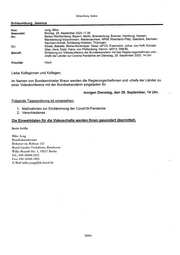 Videokonferenz der Bundeskanzlerin mit den Regierungschefinnen und Regierungschefs der Länder zum Thema Coronavirus-Infektionen am 29. September 2020, 14.00 Uhr -Teilnehmerliste- Länder: Die Regierungschefinnen und Regierungschefs aller 16 Länder. Bund: Chef BK StM Hoppenstedt BM Scholz (BMF) BM Seehofer (BMI) BM Maas (AA) BM Spahn (BMG) BM Scheuer (BMV|) St Seibert (BPA)