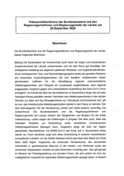 Videoschaltkonferenz der Bundeskanzlerin mit den Regierungschefinnen und Regierungschefs der Länder am 29.September 2020 Beschluss Die Bundeskanzlerin und die Regierungschefinnen und Regierungschefs der Länder fassen folgenden Beschluss: Bislang hat Deutschland die Corona-Krise auch dank der engen und konstruktiven Zusammenarbeit der Länder untereinander und mit dem Bund gut bewältigt. Der strategische Dreiklang aus allgemein geltenden Abstands- und Hygienemaßnahmen, einem konsequenten Test- und Nachverfolgungsregime sowie der gezielten Reaktion auf besondere Ausbruchsgeschehen hat sich bewährt. Insbesondere haben gemeinsame Leitlinien für die Bewältigung regional unterschiedlicher Infektionsgeschehen und Hotspots ein bundesweit vergleichbares, aber regional angepasstes Vorgehen gegen eine unkontrollierte Ausbreitung des Sars-CoV-2 Virus ermöglicht. So konnte die Zahl der Neuinfektionen in Deutschland lange Zeit auf sehr niedrigem Niveau gehalten werden. Nachdem das Infektionsgeschehen in den letzten Wochen vor allem auf das Reisegeschehen zur Urlaubszeit zurückzuführen war, gilt es nun, das innerdeutsche Infektionsgeschehen stärker in den Fokus zu nehmen. Der weit überwiegende Teil der Bevölkerung verhält sich dabei äußerst vernünftig und rücksichtsvoll. Die Bundeskanzlerin und die Regierungschefinnen und Regierungschefs der Länder danken den Bürgerinnen und Bürgern für die breite Unterstützung. Leider zeigen die Erfahrungen in jüngster Zeit aber auch, dass das Verhalten Einzelner zur Entwicklung eines neuerlichen innerdeutschen Infektionsgeschehens beitragen kann. Insgesamt steigt die Zahl der täglich gemeldeten Neuinfektionen mit SARS-CoV-2 seit Ende Juli in Deutschland leider wieder an. Noch deutlicher zeigt sich diese Entwicklung in anderen benachbarten europäischen Ländern, wo die Zahlen teilweise schon jetzt über dem Stand von Ende März 2020 liegen. Angesichts der sinkenden Temperaturen, des vermehrten Aufenthalts in geschlossenen Räumen in der Herbst- und Winterzeit sowie der drohenden Grippesaison müssen wir jetzt besonders vorsichtig sein. Dies gilt gerade im Bereich der Freizeitgestaltung und privaten Feiern, die sich zuletzt als eine der maßgeblichen Ursachen für regionales Infektionsgeschehen gezeigt haben. In diesem
