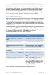 Masterplan Stadt und Region Hannover| 100 % für den Klimaschutz Projekt-Beirat (s.u.) eingeflossen. Basis der Berechnungen bildeten die Energie- und CO2-Bilanz der Stadt und der Region Hannover. Mit der Aktualisierung aller Daten der Bilanz, der Zusam- menarbeit mit dem IE Leipzig sowie der Erstellung eines Monitoringkonzepts war das Büro E4-Consult aus Hannover beauftragt. Alle Ergebnisse der Szenarienberechnungen wurden zwischenbilanziert und final mit den Expertinnen und Experten der Strategiegruppen abge- stimmt. Ausführlich dargestellt werden die Szenarienberechnungen in Kapitel 8. Wissenschaftliche Begleitung / Studien Aufgrund der weitreichenden Zielsetzungen Klimaneutralität und Energiewende wurde bereits zu Beginn auf die Zusammenarbeit mit den ansässigen Hochschulen und Forschungsinstituten gesetzt. Die Leibniz Universität Hannover mit der Leibniz Forschungsinitiative Energie 2050 "Transformation des Energiesystems" sowie die Hochschule Hannover beteiligten sich durch ihre Teilnahme an den Strategiegruppen, aber auch durch begleitende Studien, Vortragsreihen und Veranstaltungen. Gleichzeitig beteiligten sich die verschiedenen Wissenschaftlerinnen und Wissenschaftler und weitere Fachleute durch Teilnahme an den Strategiegruppen, aber auch durch begleitende Studien. Die nachfolgend in der Übersicht dargestellten Studien wurden in enger konzeptionel- ler und inhaltlicher Abstimmung mit den Strategiegruppen erarbeitet. Die Zusammenfassungen der Studien sind in Kapitel 9 dargestellt. Studie Institution Energieeinsparpotenziale im Gebäudebe- Dipl.-Ing. Benedikt Siepe, Energieberatung stand Potenzialanalyse regenerative Wärme Fernwärme-Forschungsinstitut in Hannover e.V. Potenzialanalyse zum Einsatz von Biokunst- Hochschule Hannover, Institut für Biokunst- stoffen stoffe und Bioverbundwerkstoffe (IfBB) Landwirtschaftliche Produktion und regionale Landwirtschaftskammer Niedersachsen Vermarktung Klimaneutrale Abwasser- und Abfallbehand- Leibniz Universität Hannover, Institut für lung Siedlunbswasserwirtschaft und Abfalltechnik (ISAH) Vertikale Solarfassaden in der Landeshaupt- Leibniz Universität Hannover, Institut für stadt und der Region Hannover Festkörperphysik (FKP), Abt. Solarenergie, Institut für Kartographie und Geoinformatik (IKG), Institut für Meteorologie und Klimato- logie (MUK), Leibniz Forschungszentrum Energie 2050 (LiFE 2050) Tabelle 2: Übersicht über die begleitenden Studien im Rahmen der Masterplan-Phase 1. Phase 1: Juni 2012 bis Dezember 2013 Seite 41 | 136