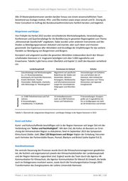 Masterplan Stadt und Region Hannover| 100 % für den Klimaschutz Alle Ergebnisse sind im folgenden Teil II zusammengefasst: Die Präambel in Kapitel 6 beschreibt übergeordnete Prämissen von grundlegender Bedeu- tung für alle Strategiegruppen Die Vision aller Gruppen für die klimaneutrale Region im Jahr 2050 ist im Kapitel 7 zusam- mengefasst. Ergänzend zur Arbeit der Strategiegruppen wurden Szenarien-Annahmen bis 2050 entwi- ckelt. Alle Ergebnisse der Szenarienberechnungen wurden zwischenbilanziert und final mit den Expertinnen und Experten der Strategiegruppen abgestimmt. Die Ergebnisse sind in Kapitel 8 und 9 dargestellt. Die Arbeit der Strategiegruppe Szenarien ist direkt in die Erarbeitung der Szenarienberech- nungen eingeflossen. Dieser Prozess ist am Anfang des Kapitels 8 beschrieben. Die aus der Vision entwickelten Maßnahmen sind in den Strategischen Handlungsfeldern in Kapitel 9 zusammenfassend dargestellt. Die projektbegleitenden Studien wurden in enger konzeptioneller und inhaltlicher Ab- stimmung mit den Strategiegruppen erarbeitet. Die Zusammenfassungen der Studien wurden in Kapitel 9 den entsprechenden Handlungsfeldern zugeordnet. Politische Instrumente und notwendige Rahmenbedingungen wurden den Handlungsfel- dern in Kapitel 10 zugeordnet. Die vorliegenden Ergebnisse basieren ausschließlich auf den eingebrachten Inhalten der beteiligten Expertinnen und Experten und haben Empfehlungscharakter. Bürgerinnen- und Bürger-Dialoge Von Frühjahr bis Herbst 2013 wurden verschiedenste Werkstattangebote, Veranstaltungen, Konferenzen und Quartiersdialoge für die Bevölkerung im gesamten Regionsgebiet zum Thema „klimaneutrale Gesellschaft“ angeboten. Die Ergebnisse aller Aktivitäten sind Grundlage der Empfehlungen für die zukünftige Beteiligung von Bürgerinnen und Bürgern. Auch in den Kommunen des Umlands wurden verschiedenartigste Veranstaltungen für ver- schiedene Zielgruppen. Insgesamt beteiligten sich über 5.000 Jugendliche und Erwachsene. Die ausführlichen Fassungen sind in der Dokumentation des Masterplan-Prozesses online unter www.klimaschutz2050.de verfügbar. Phase 1: Juni 2012 bis Dezember 2013 Seite 45 | 136