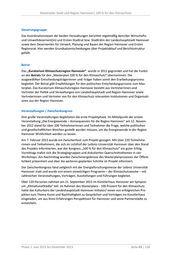 Masterplan Stadt und Region Hannover| 100 % für den Klimaschutz Steuerungsgruppe Das Koordinationsteam der beiden Verwaltungen berichtet regelmäßig dem/der Wirtschafts- und Umweltdezernent(in) und Ersten Stadtrat bzw. Stadträtin der Landeshauptstadt Hannover sowie dem Dezernenten für Umwelt, Planung und Bauen der Region Hannover und Ersten Regionsrat. Hier werden Grundsatzentscheidungen über Projektablauf und Berichtsstruktur gefällt. Beirat Das „Kuratorium Klimaschutzregion Hannover“ wurde in 2012 gegründet und hat die Funkti- on des Beirats für den „Masterplan 100 % für den Klimaschutz“ übernommen. Die ausgewählten Entscheidungsträgerinnen und -träger haben somit den Erarbeitungsprozess begleitet. Der Beirat gibt Empfehlungen für den politischen Entscheidungsprozess zum Mas- terplan. Das Kuratorium Klimaschutzregion Hannover besteht aus Vertreterinnen und Vertreter der Politik und Verwaltungen von Landeshauptstadt und Region Hannover sowie Vertreterinnen und Vertreter von für den Klimaschutz relevanten Institutionen und Organisati- onen aus der Region Hannover. Veranstaltungen / Zwischenkongress Drei große Veranstaltungen begleiteten die erste Projektphase. Im Mittelpunkt der ersten Veranstaltung „Die Energiewende – Konsequenzen für die Region Hannover“ am 12. Novem- ber 2012 stand für über 100 Teilnehmerinnen und Teilnehmer die Frage, welche politischen und gesellschaftlichen Weichen gestellt werden müssen, um die Energiewende in der Region Hannover Wirklichkeit werden zu lassen. Am 7. Februar 2013 wurde ein Zwischenfazit zum Projekt gezogen. Mit über 220 Teilnehme- rinnen und Teilnehmern, die sich im Lichthof der Leibniz-Universität Hannover über den Stand des Projekts informierten, war der Kongress „100 % für den Klimaschutz“ ein guter Erfolg. Vormittags trafen sich die Strategiegruppen und diskutierten Querschnittsthemen in vier Workshops. Am Nachmittag wurden Zwischenergebnisse des Masterplanprozesses der Öffent- lichkeit präsentiert und über die weiteren geplanten Schritte im Projekt informiert. Der Zwischenkongress fand zeitgleich mit der Energieforschungsmesse der Leibniz Universität Hannover statt und wurde von einem einwöchigen Programm – der Klimaschutzwoche – mit zahlreichen Veranstaltungen, Vorträgen, Ausstellungen und Führungen begleitet. Über 120 Personen nahmen am 21. September 2013 im Künstlerhaus Hannover am Symposi- um „KlimaKunstStädte“ teil. Im Rahmen des Masterplans - 100 Prozent für den Klimaschutz hatte das Kulturbüro der Landeshauptstadt Hannover Initiator/-innen von erfolgreichen Pro- jekten zum Thema Kunst und Nachhaltigkeit zu Gesprächen und Vorträgen ins Künstlerhaus eingeladen, um aus ihren Erfahrungen Perspektiven für Hannover und seine Partnerstädte zu entwickeln. Phase 1: Juni 2012 bis Dezember 2013 Seite 43 | 136