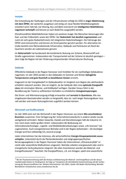 Masterplan Stadt und Region Hannover| 100 % für den Klimaschutz Verkehr Die Entwicklung der Siedlungen und der Infrastrukturen erfolgt bis 2050 in enger Abstimmung mit dem ÖPNV, der weiterhin ausgebaut und stetig um neue flexible Mobilitätsangebote erweitert wird: Fahrrad, Car-Sharing, Bus und Bahn sind durch ein intelligentes Mobilitätsma- nagement verknüpft und können je nach Bedürfnis ausgewählt werden. Klimafreundliche Mobilitätsformen haben ein positives Image: Die Menschen bevorzugen den Rad- und den Fußverkehr sowie den ÖPNV. Der Radverkehr hat deutlich zugenommen und nutzt ein sehr gutes Radverkehrsnetz mit integrierten Radschnellwegen. Die Fahrzeuge des ÖPNV sind emissionsfrei und können als Stromspeicher genutzt werden. Für alternative An- triebe besteht eine flächendeckende Infrastruktur, Gebäude und Parkräume am Rand der Quartiere werden als Ladestationen genutzt. Im Güterverkehr hat bundesweit die kombinierte Nutzung von Schiene, Binnenschiff und Straße zugenommen. Insbesondere der Transportanteil auf der Schiene ist deutlich gestiegen – dem trägt die Region mit der Förderung entsprechender Infrastrukturen Rechnung. Gebäude Öffentliche Gebäude in der Region Hannover sind Vorbilder für ein nachhaltiges Gebäudema- nagement. Im Jahr 2050 werden in den Gebäuden im Sommer und Winter behagliche Temperaturen und gute Raumluft zu bezahlbaren Kosten erreicht. Insgesamt ist der Energiebedarf im Gebäudesektor im Vergleich zum Beginn des Jahrhunderts erheblich reduziert worden. Dies ist möglich, da die Gebäude über eine optimale Energieeffi- zienz mit minimalem Wärme- und Kühlbedarf verfügen. Darüber hinaus führt in der Bevölkerung der Trend zu suffizientem Verhalten zu erheblichen Energieeinsparungen. Die Strom- und Wärmeversorgung erfolgt erneuerbar und vernetzt in Quartieren. Alle neu eingebauten Baumaterialien werden so hergestellt, dass sie nach langer Nutzungsdauer recy- celt werden und neuen Nutzungsformen zugeführt werden können. Wirtschaft und Stoffkreisläufe Im Jahr 2050 setzt sich die Wirtschaft in der Region Hannover aus einem Mix verschiedener Branchen zusammen. Eine Verlagerung der Unternehmensstandorte in andere Länder wurde weitgehend verhindert. Neben Gewerbe, Handel und Dienstleistungen hält die Industrie im- mer noch einen relativ großen Anteil. Insbesondere die Bedeutung von Informationstechnologie-, Logistik- und Mobilitätsdienstleistungen sowie „Life Sciences“ hat zugenommen. Auch energieintensive Betriebe sind in der Region beheimatet – die benötigte Energie wird fast vollständig CO2-neutral erzeugt. Jedes Unternehmen hat das Interesse, alle wirtschaftlichen Energie-Einsparpotenziale auszu- schöpfen. Unterstützt durch die flächendeckenden und zielgruppenspezifischen Beratungsangebote in der Region Hannover haben die Unternehmen „Klimaneutralität“ er- reicht oder wesentliche Maßnahmen umgesetzt. Betriebe arbeiten energieautark oder sind in energetische Verbundsysteme integriert. Bei allen Investitionen werden die Material- und 15 Energieflusskosten beachtet. Die Energieeffizienz, z.B. von Anlagen, spielt eine wesentliche 15 Bei der Flusskostenrechnung steht die Analyse und Bewertung der Material- und Energieflüsse und der daraus resultierenden Kosten im Vordergrund. Sie trägt zur Transparenz der betrieblichen Kostenrechnung und der Verbes- serung der Ressourceneffizienz bei. Weitere Informationen: ISO 14051. Quelle: MU Baden-Württemberg, Betriebli- Betrieblicher Umweltschutz www.umweltschutz-bw.de. Phase 1: Juni 2012 bis Dezember 2013 Seite 48 | 136