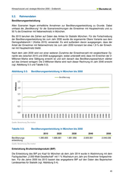 Klimaschutzziel und -strategie München 2050 – Endbericht 5.2. Rahmendaten Bevölkerungsentwicklung Allen Szenarien liegen einheitliche Annahmen zur Bevölkerungsentwicklung zu Grunde. Dabei umfasst die „Bevölkerung“ für die Szenariorechnungen die Einwohner mit Hauptwohnsitz und zu 50 % die Einwohner mit Nebenwohnsitz in München. Bis 2015 beruhen die Zahlen auf Daten des Amtes für Statistik München. Für die Fortschreibung der Bevölkerungsentwicklung bis zum Jahr 2030 wurde die sogenannte Obere Variante aus dem Demografiebericht I (Kürbis 2015) verwendet. Es wird außerdem davon ausgegangen, dass der Anteil der Einwohner mit Nebenwohnsitz bis zum Jahr 2050 konstant bei etwa 1,9 % der Einwoh- ner mit Hauptwohnsitz bleibt. Nach dem Jahr 2030 wird von einer weiteren Zunahme der Einwohnerzahl mit vergleichbarer Dy- namik wie zwischen 2015 und 2030 ausgegangen, wobei unterstellt wird, dass mit Erreichen der 2- Millionen-Marke eine Sättigung erreicht ist und sich danach das Bevölkerungswachstum stärker auf das Umland verlagert. Die 2-Millionen-Marke wird nach dieser Rechnung im Jahr 2040 erreicht (vgl. Abbildung 5-3 und Tabelle 5-2). Abbildung 5-3: Bevölkerungsentwicklung in München bis 2050 Quelle: Berechnung Öko-Institut Tabelle 5-2: Bevölkerungsentwicklung in München bis 2050 2010 2020 2030 2040 2050 Bevölkerungs- 1.395.655 1.686.681 1.851.956 2.005.561 2.046.036 entwicklung Quelle: Berechnung Öko-Institut Entwicklung Bruttoinlandsprodukt (BIP) Die Entwicklung des BIP pro Kopf für München ab dem Jahr 2014 wurde in Abstimmung mit dem Fachgutachten „2.000-Watt-Gesellschaft“ mit 1 % Wachstum pro Jahr pro Einwohner fortgeschrie- ben. Für die Jahre 2000 bis 2013 basiert das angegebene BIP auf den Daten des Bayerischen Landesamtes für Statistik (vgl. Abbildung 5-4). 45