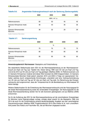 Klimaschutzziel und -strategie München 2050 - Endbericht Tabelle 5-6: Angestrebter Endenergieverbrauch nach der Sanierung (Sanierungstiefe) 2020 2030 2040 2050 kWh / m² / a Referenzszenario 60 50 45 45 Szenario Klimaschutz mode- 48 40 36 36 rat Szenario Klimaneutrales 38 32 29 29 München Quelle: Annahmen Öko-Institut Tabelle 5-7: Sanierungswirkung 2020 2030 2040 2050 % Referenzszenario 75 75 75 75 Szenario Klimaschutz mode- 80 80 80 80 rat Szenario Klimaneutrales 95 95 95 95 München Quelle: Annahmen Öko-Institut Anwendungsbereich Warmwasser: Basisjahre und Fortschreibung Die wesentliche Stellschraube beim EEV für die Warmwasserbereitung ist der Warmwasserver- brauch pro Kopf und Tag (vgl. Tabelle 5-8). Dieser betrug 1990 noch 42 Liter pro Kopf und Tag, und ist bis 2014 auf 45 Liter pro Kopf und Tag gestiegen (Matthes 2009). Im Referenzszenario und im Szenario Klimaschutz moderat wird dieser Wert konstant bis 2050 fortgeschrieben. Im Szenario Klimaneutrales München findet jedoch zwischen 2015 und 2050 in Folge von sparsamerem Ver- halten welches durch entsprechende Einrichtungen unterstützt wird eine Verbrauchsminderung von 45 Liter pro Kopf und Tag auf 42 Liter pro Kopf und Tag statt. Zur Berechnung des Energie- verbrauchs wird angenommen, dass der Temperaturhub für die Bereitstellung von Warmwasser 35 Kelvin beträgt. Weitere Stellschrauben für die Entwicklung des Warmwasserverbrauchs sind der Nutzungsgrad für die lokale Warmwasserbereitung sowie die verwendeten Energieträger. Die Nutzungsgrade für die lokale Warmwasserbereitung werden hier für alle Szenarien gleichgesetzt und aus Matthes (2009) entnommen. Da für die Aufteilung des EEV für die Warmwasserbereitung auf die verschiedenen Energieträger für München keine Datengrundlage vorliegt, erfolgte diese sowohl für die Basisjahre 1990 und 2014 als auch für die Fortschreibung anhand deutschlandweiter Angaben aus den verschiedenen Szenariorechnungen (Matthes 2009, Projektionsbericht 2015 [Öko-Institut et al, noch unveröffent- licht] sowie Öko-Institut und Fraunhofer ISI), die auf München angepasst wurden. 50