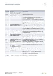 Die Maßnahmenvorschläge nach Handlungsfeldern 41 Kennung Maßnahme Teilmaßnahme Einbindung der strategischen Schwerpunkte aus dem Mas- MOB 1 Fahrradinfrastruktur stärken terplan Klimaschutz in den Masterplan Münster Multimodale Mobilität fördern und bestehendes SPNV- und ÖPNV-Angebot verbessern Autoarme Innenstadt und autoarme Wohnquartiere entwi- ckeln Zielgruppengerechte Mobilitäts-Sharing-Konzepte entwi- ckeln Klimaschonende Mobilität in MOB 2 Umstellung des kommunalen Fuhrparks auf Elektroautos der Stadtverwaltung fördern Aufbau einer Koordinierungsstelle "Elektromobilität" Städtisches Mobilitätsmanagement unter Klimaschutzas- pekten Umstellung des ÖPNV auf Umstellung der Münsteraner Busflotte auf Elektro- und MOB 3 Elektro- und Wasserstoffmobi- Wasserstoffmobilität lität Ausbau von Förderstrukturen MOB 4 Städtisches Förderprogramm für E-Lastenräder für den Umweltverbund Städtisches Förderprogramm für innovative Mobilitätsan- gebote Integriertes regionales ÖPNV- Etablierung eines integrierten ÖPNV-SPNV-Systems mit MOB 5 SPNV-System erhöhten Takten in der Stadtregion Aufbau einer Ladeinfrastruktur Abgestimmte Bedarfsplanung für öffentliche Ladeinfra- MOB 6 für den Endnutzer struktur und Koordination mit Bestand Dienstleistungsangebote für private Ladeinfrastruktur Öffentlichkeitsarbeit für Klima- freundliche Mobilität: Zielgrup- MOB 7 pengerechte Kommunikation Mobilitätsangebote zum Testen und Ausprobieren konkreter und innovativer Mo- bilitätsangebote Öffentlichkeitsarbeit umweltfreundliche Mobilität Best-Practice "Klimafreundliche Mobilität" Tabelle 4-9 Liste der Maßnahmen und Teilmaßnahmen im Handlungsfeld Mobilität Bericht_Massnahmenkatalog 2030_Stand_2019_08_26-final_JS.docx Stand: 02.09.2019 17:43:00