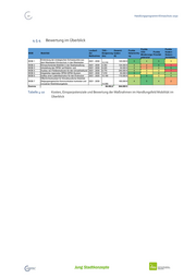 42 Handlungsprogramm Klimaschutz 2030 4.5.4 Bewertung im Überblick Punkte Punkte Laufzeit THG - Gesamt- Punkte CO2- Punkte Kosten- MOB Mobilität der Einsparung kosten Hebelwirku Minderungs Priorität Nutzen- Maßnahme (t/a) (€) ng potenzial Verhältnis Einbindung der strategischen Schwerpunkte aus MOB 1 2021 - 2030 120.000 € 5 4 5 3 dem Masterplan Klimaschutz in den Masterplan 12.316 MOB 2 Klimaschonende Mobilität in der Stadtverwaltung 2021 - 2030 4.393 124.000 € 4 2 5 1 MOB 3 Umstellung des ÖPNV auf Elektro- und 2021 - 2030 6.225 30.000 € 4 2 4 5 MOB 4 Ausbau von Förderstrukturen für den Umweltverbund 2021 - 2030 6.770 240.000 € 4 3 3 1 MOB 5 Integriertes regionales ÖPNV-SPNV-System 2021 - 2030 7.019 55.000 € 5 3 4 4 MOB 6 Aufbau einer Ladeinfrastruktur für den Endnutzer 2021 - 2025 15.190 110.000 € 3 5 3 4 Öffentlichkeitsarbeit für Klimafreundliche Mobilität: MOB 7 Zielgruppengerechte Kommunikation konkreter und 2021 - 2030 165.000 € 4 5 4 2 innovativer Mobilitätsangebote 14.089 Summe 66.002,0 844.000 € Tabelle 4-10 Kosten, Einsparpotenziale und Bewertung der Maßnahmen im Handlungsfeld Mobilität im Überblick