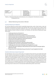 48 Handlungsprogramm Klimaschutz 2030 oder konkrete Beratungsleistungen subsumiert werden können. Die Möglichkeiten der direkten Investition oder Trägerschaft durch die Kommune selbst ist häufig aufgrund von finanziellen Restriktionen beschränkt und findet sich im Grunde nur im eigenen Einflussbereich (kommunale Gebäude) wider. Der vorliegende Handlungsprogramm Klimaschutz 2030 versucht, die Handlungsmöglichkeiten der Stadt Münster in den ver- schiedenen Themenfeldern entsprechend auszureizen. Ordnungs- / Planungs- Finanzielle Förde- Fachliche und organisa- Information und Öffent- Investition und Trä- recht rung torische Unterstützung lichkeitsarbeit gerschaft Mittel Gering bis mittel Mittel bis hoch Mittel bis hoch Keine Möglichkeit Abbildung 5-3: Einordnung der kommunalen Handlungsmöglichkeiten in einem Themenfeld (Beispiel hier: Energetisch hochwertiger Neubau) Die Maßnahmen haben wiederum direkte und indirekte Auswirkungen auf die Energie – und THG-Bilanz der Stadt Münster. Im nächsten Schritt wurden deswegen diese Auswirkungen für alle Maßnahmen und entspre- chend mögliche Erfolgsindikatoren genannt (vgl. Tabelle 5-1). Es ist dabei zu berücksichtigen, dass die Maß- nahme und die Teilmaßnahmen nur Ergänzungen von Maßnahmen in einem Mehrebenensystem sind (s.o.). Die Entwicklungen in der Energie- und THG-Bilanz sind deswegen das Ergebnis des Zusammenspiels all dieser Maßnahmen und keine Bewertung der Einzelmaßnahmen. Eine Bewertung dieser Maßnahmen erfolgt im nächsten Schritt. Tabelle 5-1: Messbarkeite auf Makroebene (über Energie und THG-Bilanz der Stadt (Beispiel hier: Energetisch hochwertiger Neubau) sowie daraus ableitbare Erfolgsindikatoren Direkt Indirekt Energie- und THG-Bilanz der Gebäude (Vergleich zu Neubau nach Über Energie- und THG-Bilanz der Stadt (theoretische (witte- EnEV) rungskorrigierte) Steigerung zwischen zwei Jahren mit und ohne Neubau Erfolgsindikatoren der Maßnahme Energetischer Standard: Anteil des Neubaus (m² ) gegenüber EnEV-Standard Suffizienz: Wohnfläche pro Person im Neubau Im nächsten Schritt wird der Fokus von der übergeordneten Maßnahme auf die einzelnen Teilmaßnahmen gelegt. Für diese wird zunächst in den Maßnahmenblättern beschrieben, welche kommunalen Handlungs- möglichkeiten (s.o.) durch die Einzelmaßnahmen adressiert werden (vgl. Tabelle 5-2). Daneben werden direk- te Faktoren für Erfolge bzw. Meilensteine genannt. Diese Faktoren und Meilensteine können qualitativ und quantitativ sein. Zumeist sind diese Erfolgsfaktoren und Meilensteindarstellung ohne weiterführende Evalua- tionsarbeit zu erfassen. Werden zusätzlichen Aufgaben nötig, wird ein Hinweis auf eine weiteführende Evalua- tion gegeben. Lassen sich aus den Faktoren und Meilensteine konkrete Erfolgsindikatoren ableiten, wird dies ebenfalls benannt. Vorteil an solchen Indikatoren ist, dass sich Erfolge der Maßnahmen gegenüber absoluten Werten entsprechend besser einordnen lassen. Aus den Indikatoren wiederum lassen für verschiedene Teil- maßnahme weitere Werte ableiten, die konkrete Energie- THG- oder finanzielle Einsparungen beinhalten. Teilmaßnahme Betroffene kommunale Direkte Erfolgskontrolle / Möglicher Indikator Ableitbare Werte Handlungsmöglichkeiten Meilensteine aus Indikatoren "Münsters Energie- - Flankieren, - Weiterentwicklung des - Anteil Energiespar- Gegenüber gesetz- sparhaus 55" für - Information und Standards erfolgt (u.a. häuser 55 am Neubau lichen Standards Wohn- und Nicht- Öffentlichkeitsarbeit um ökologischer As- (m²) pekte) - Eingesparte