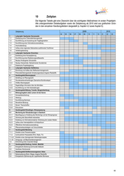 10 Zeitplan Die folgende Tabelle gibt eine Übersicht über die wichtigsten Maßnahmen im ersten Projektjahr. Alle untergeordneten Detailaufgaben sowie die Zeitplanung ab 2010 sind aus grafischen Grün- den in den einzelnen Handlungsfeldern dargestellt (s. Kapitel 4.2 sowie Kapitel 5). Zeitplanung 2009 2010 04 05 06 07 08 09 10 11 12 01 02 03 1 Leitprojekt: Saerbecker Sonnenseite 1.1 Erarbeitung einer Potenzialerhebungsstudie 1.2 Durchführung und Auswertung der Fragebogenaktion 1.3 Durchführung einer Informationsveranstaltung 1.4 Anschubberatung: 1.5 Aufbau eines regionalen Netzwerkes ausführender Fachfirmen 1.6 Vertiefungsberatung: 2 Leitprojekt: Saerbecker Einsichten 2.1 Erarbeitung einer Konzeptplanung 2.2 Durchführung eines Realisierungswettbewerbs 2.3 Neubau Kindergarten Schulstraße 2.4,5 Neubau Heizzentrale, Nahwärmenetz Grundschule 2.7 Didaktische Projektbegleitung 3 Leitprojekt: Saerbecker Stoffströme 3.1 Einrichtung und Aufbau des Wallheckenmanagements 3.2 Potenzialerhebungsstudie Umsetzungsanalyse biogener Reststoffe 4 Handlungsfeld Bioenergiepark 4.1 Schaffung von Planungsrecht 4.2 Grunderwerbsverhandlungen Übernahme Munitionsdepot 4.3 InfoBox Bioenergiepark 4.3.2 Regelmäßige Information über die Aktivitäten 4.3.3 Durchführung von Info-Veranstaltungen 5 Handlungsfeld Bildung, Transfer, Bürgermitwirkung 5.1 Bildungsangebot Leben Lernen mit der Sonne 5.1.1 Konzeptüberarbeitung 5.1.3 Werbung 5.1.4 Durchführung Seminare 5.3.2 Monatliche Beratung 5.3.3 Monatl. Thementreffen 5.3.4 Exkursionen 6 Handlungsfeld Klimafolgen, Klimaanpassung 6.1 Monitoring der Klimaänderungen in Saerbeck 6.1.1 Beauftragung zur Erstellung des Monitorings und der Klimaprognose 6.2.1 Gründung des Gesundheits-netzwerkes 6.2.2 Erstellung von Informationsmaterial, Einbindung der Lokalen Medien 6.2.3 Aufbau einer Internetplattform mit Nutzerforum 6.2.4 Öffentliche Informationsveranstaltung 6.4 Pflanzenanbaustrategien und Versuchsfelder 7 Handlungsfeld Marketing 7.1.1 Erstellen eines Pressekonzeptes 7.1.2 kontinuierliche Pressearbeit (Print, Radio, TV) 7.1.4,5 Erstellen eines überregionalen Marketingkonzeptes 7.1.10 Anregungs- und Beschwerdemanagement 7.2 Entwicklung eines Corporate Design 8 Handlungsfeld Siedlung, Verkehr, Mobilität 8.1 Energetische Sanierung kommunale Gebäude 8.3 Autofreies Wochenende 9 Handlungsfeld Stoffstrommanagement, Netze 9.3 Netzerweiterung Strom, Biogas, biogene Reststoffe 9.4 Energetische Optimierung der Logistikketten Biomasse 49