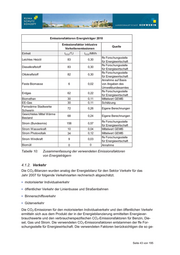Emissionsfaktoren Energieträger 2010 Emissionsfaktor inklusive Quelle Vorkettenemissionen Einheit tCO2 /TJ tCO2 /MWh ffe Forschungsstelle Leichtes Heizöl 83 0,30 für Energiewirtschaft ffe Forschungsstelle Dieselkraftstoff 83 0,30 für Energiewirtschaft ffe Forschungsstelle Ottokraftstoff 82 0,30 für Energiewirtschaft Annahme auf Basis Feste Biomasse 6 0,02 von Angaben des Umweltbundesamtes ffe Forschungsstelle Erdgas 62 0,22 für Energiewirtschaft Biomethan 30 0,11 Mittelwert GEMIS EE-Gas 30 0,11 Schätzung Fernwärme Stadtwerke 72 0,26 Eigene Berechnungen Schwerin Gewichtetes Mittel Wärme 68 0,24 Eigene Berechnungen Bestand ffe Forschungsstelle Strom (Bundesmix) 158 0,57 für Energiewirtschaft Strom Wasserkraft 10 0,04 Mittelwert GEMIS Strom Photovoltaik 34 0,12 Mittelwert GEMIS ffe Forschungsstelle Strom Windkraft 9 0,03 für Energiewirtschaft Biomüll 0 0 Annahme Tabelle 10: Zusammenfassung der verwendeten Emissionsfaktoren von Energieträgern 4.1.2. Verkehr Die CO2-Bilanzen wurden analog der Energiebilanz für den Sektor Verkehr für das Jahr 2007 für folgende Verkehrsarten rechnerisch abgeschätzt. s motorisierter Individualverkehr s öffentlicher Verkehr der Linienbusse und Straßenbahnen s Binnenschiffsverkehr s Güterverkehr Die CO2-Emissionen für den motorisierten Individualverkehr und den öffentlichen Verkehr ermitteln sich aus dem Produkt der in der Energiebilanzierung ermittelten Energiever- brauchswerte und den verbraucherspezifischen CO2-Emissionsfaktoren für Benzin, Die- sel, Gas und Strom. Die verwendeten CO2-Emissionsfaktoren entstammen der ffe For- schungsstelle für Energiewirtschaft. Die verwendeten Faktoren berücksichtigen die so ge- Seite 43 von 195