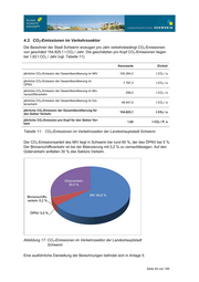 4.3. CO2-Emissionen im Verkehrssektor Die Bewohner der Stadt Schwerin erzeugen pro Jahr verkehrsbedingt CO2-Emissionen von geschätzt 154.825,1 t CO2 / Jahr. Die geschätzten pro Kopf CO2-Emissionen liegen bei 1,62 t CO2 / Jahr (vgl. Tabelle 11). Kennwerte Einheit jährliche CO2-Emission der Gesamtbevölkerung im MIV 100.284,2 t CO2 / a jährliche CO2-Emission der Gesamtbevölkerung im 7.797,3 t CO2 / a ÖPNV jährliche CO2-Emission der Gesamtbevölkerung im Bin- 296,0 t CO2 / a nenschiffsverkehr jährliche CO2-Emission der Gesamtbevölkerung im Gü- 46.447,5 t CO2 / a terverkehr jährliche CO2-Emission der Gesamtbevölkerung für 154.825,1 t CO2 / a den Sektor Verkehr jährliche CO2-Emission pro Kopf für den Sektor Ver- 1,62 t CO2 / P, a kehr Tabelle 11: CO2-Emissionen im Verkehrssektor der Landeshauptstadt Schwerin Der CO2-Emissionsanteil des MIV liegt in Schwerin bei rund 65 %, der des ÖPNV bei 5 %. Der Binnenschiffsverkehr ist bei der Bilanzierung mit 0,2 % zu vernachlässigen. Auf den Güterverkehr entfallen 30 % des Sektors Verkehr. Abbildung 17: CO2-Emissionen im Verkehrssektor der Landeshauptstadt Schwerin Eine ausführliche Darstellung der Berechnungen befindet sich in Anlage 5. Seite 45 von 195