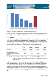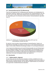 4.4. Zusammenfassung der CO2-Bilanzierung Fasst man die Ergebnisse der CO2-Bilanzierung der stationären und nichtstationären An- wendungen zusammen, ergeben sich CO2-Emissionen der Landeshauptstadt für das Jahr 2010 von rund 571.000 t. Dieser Wert entspricht einer CO2-Emission pro Kopf von rund 6 t. Die Aufteilung der CO2-Emissionen auf die einzelnen Verbrauchssektoren zeigt Abbil- dung 18. Abbildung 18: Aufteilung der CO2-Emissionen des Jahres 2010 nach Ver- brauchssektoren (Verkehr wie 2007) Es zeigt sich, dass die großen Verbrauchssektoren Industrie/Gewerbe, Verkehr und Kleinverbrauch (Haushalte und andere) zu je etwa 30 % zu den Gesamt-Emissionen bei- tragen. Auf den Sektor Öffentliche Einrichtungen entfallen 12 % der Gesamt-Emissionen. In der vorgenommen Bilanzierung sind sowohl Emissionsquellen wie auch Emissionssen- ken wie umliegende Wälder, Moore und Seenlandschaften nicht berücksichtigt. Das Po- tenzial des Erhalts von Wäldern und Seen sowie der Renaturierung und Wiedervernäs- sung von Mooren als CO2-Senken sollte jedoch bei der Betrachtung von Klimaschutz- maßnahmen nicht außer Acht gelassen werden (vgl. Kapitel 6.2) 4.5. Benchmarks 4.5.1. Städtevergleich, allgemein Um den Status Quo der CO2-Emissionen bewerten zu können, empfiehlt sich ein Ver- gleich mit den Pro-Kopf-Emissionen anderer Städte. Ausgewählt wurden hierzu Städte mit unterschiedlicher Bevölkerungszahl, die nach gleicher Vorgehensweise (CO2-Emissionen mit so genannten Vorkettenemissionen) bilanzieren. Seite 46 von 195