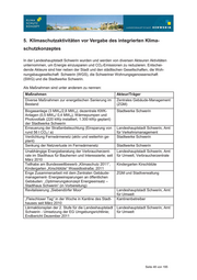 Maßnahmen Akteur/Träger Etablierung des „Autofreien Sonntages“ in der Lan- Landeshauptstadt Schwerin, ab deshauptstadt- 2010, 2011 2012 ADFC Arbeitsgruppe „Energiezukünfte“ mit den Stadtwerken, Stadtwerke Schwerin Energiekonzept der Stadtwerke als wichtiger Bestand- teil im zu erarbeitenden Klimaschutzkonzept. „ Ener- gie, die nicht gebraucht wird, braucht auch nicht her- gestellt zu werden“ Zusammenarbeit mit der IHK und HWK Schwerin, IHK, HWK, Landeshauptstadt Entwicklung Modellpark für innovative Energietechni- Schwerin ken für Verbraucher (geplant) Ausstellung „Klimaschützen kann jeder!“ im Stadthaus Landeshauptstadt Schwerin, Amt der Landeshauptstadt Schwerin- Februar 2010 für Umwelt, Verbraucherzentrale Allgemeine Vorsorgemaßnahmen für Schwerin- kli- Amt für Umwelt, SAE/WAG mabedingte Witterungserscheinungen, zum Beispiel Starkregenereignisse, zum Beispiel Regenrückhalte- becken Radverkehrsförderung durch Neubau von Radwegen, Landeshauptstadt Schwerin im Aus- und Umbau von benutzungspflichtigen Radwe- Rahmen des Gesamtverkehrs- gen beziehungsweise „anderen Radwegen“, Markie- konzeptes [24] [25] des Fahrrad- rung von Schutzstreifen, Verbesserung von Fahr- konzeptes 2004 [26] und des bahnbelägen, Freigabe von Einbahnstraßen für den Radverkehrskonzeptes 2020 [27] Radverkehr entgegen der Fahrtrichtung, Verbesse- rung der Radverkehrsführung, Markierung von Radfur- ten an Kreuzungen und Einmündungen, Anwendung radfreundlicher LSA-Schaltungen, Schaffung von Ab- stellmöglichkeiten und wettergeschützter Bike and Ri- de Plätze, Bau von Bordabsenkungen, Entfernung von Licht-, Ampelmasten und Verkehrsschildern auf Rad- wegen, Ausbau der Wegweisung an den Radfernrou- ten und innerstädtischen Hauptrouten, Herausgabe eines neuen Stadtplanes mit Tourentipps für Radfah- rer. Fußverkehrsförderung durch die Neugestaltung der Landeshauptstadt Schwerin im Fußgängerzone, die Herstellung von Gehwegen, die Rahmen des Gesamtverkehrs- Umsetzung von Maßnahmen zur Sicherung der konzeptes Schulwege und ein behindertengerechter Ausbau bei Neubauten. Förderung des öffentlichen Personennahverkehrs Landeshauptstadt Schwerin und (Bus- und Bahn) durch Neubau von vier und Ausbau Nahverkehr Schwerin GmbH im von elf Haltestellen für den Straßenbahn- und Linien- Rahmen des Gesamtverkehrs- busbetrieb, Neubau der Haltepunkte „Margaretenhof“ konzeptes und „Schwerin-Mitte“, Ausbau des Netzes im Omni- busverkehr durch Einbeziehung der Neubaugebiete Krebsförden, Friedrichsthal, Neumühle / Lankow und Werdervorstadt, Anpassung der Lichtsignalanlagen zur Bevorrechtigung des ÖPNV, Umrüstung des Fahr- zeugparks mit Niederflurgelenkstraßenbahnen. Seite 49 von 195