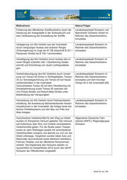 Maßnahmen Akteur/Träger Förderung des öffentlichen Schiffsverkehrs durch die Landeshauptstadt Schwerin und Sanierung der Anlegestelle in der Schlossbucht und Nahverkehr Schwerin GmbH im eine Verbesserung der Ausstattung der Schiffe. Rahmen des Gesamtverkehrs- konzeptes Verlagerung von Kfz-Verkehr aus der Innenstadt Landeshauptstadt Schwerin im durch vierspurigen Ausbau des äußeren Ringes Rahmen des Gesamtverkehrs- (Ortsumgehung) im Zuge der B 106 (Abschnitt B 321 / konzeptes Pampower Straße bis B 104 / Lärchenallee). Verstetigung des Kfz-Verkehrs durch Ausbau des in- Landeshauptstadt Schwerin im neren Ringes (Ostorfer Ufer / Obotritenring Südab- Rahmen des Gesamtverkehrs- schnitt) und Einrichtung von neuen Lichtsignalanla- konzeptes gen. Verkehrsberuhigung des Kfz-Verkehrs durch Umset- Landeshauptstadt Schwerin im zung von Tempo-30-Zonen in Wohngebieten, Tempo- Rahmen des Gesamtverkehrs- 30 zur Schulwegsicherung und Tempo-30 auf Haupt- konzeptes und dem Konzept verkehrsstraßen in der Innenstadt. Tempo-30 in der Innenstadt [28] Versuchsweise Tempo-30 auf dem Obotritenring mit Ampeloptimierung sowie Tempo-30 zwischen der Von-Flotow-Straße und Robert-Beltz-Straße unter Beibehaltung der Vierspurigkeit. Vermeidung von Kfz-Verkehr durch Parkraumbewirt- Landeshauptstadt Schwerin im schaftung, die Ausweisung flächendeckender Anwoh- Rahmen des Gesamtverkehrs- nerparkzonen in der Innenstadt, die Anlage eines sta- konzeptes tischen Parkleitsystems und den Bau von Park and Ride Anlagen Verschiedene Verkehrsmittel für den Weg zur Arbeit Allgemeiner Deutscher Fahr- wurden im Schweriner Versuch getestet. Der Versuch radclub (ADFC), Regionalgruppe soll Aufschluss über Sinn und Vorteile verschiedener Schwerin Verkehrsmittel geben. Für die Studie waren Testper- sonen an zehn Werktagen jeweils mit verschiedenen Verkehrsmitteln morgens und abends zur und von der Arbeit unterwegs. Verglichen wurden dabei Auto und Motorroller (konventionell sowie elektrisch betrieben), Fahrrad, Pedelec und der öffentliche Personennah- verkehr. Die Ergebnisse des Versuchs werden vo- raussichtlich im Herbst/Winter 2012 durch den ADVF Schwerin der Öffentlichkeit vorgestellt. Seite 50 von 195