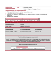 Elektromobilitätskonzept und ein Masterplan zur Förderung der Elektromobilität in Augsburg erstellt. • Drastischer Wandel im Mobilitätsverhalten • Einschränkung des individuellen Mobilitätsverhaltens • Soziale Gerechtigkeit/Verwerfungen Hemmnisse in Bezug auf die • Flächendeckende Ladeinfrastruktur von Nöten Maßnahmenumsetzung • Versorgung mit Erneuerbaren Energien, um Klimaeffekte erzielen zu können • Verkehrs- und stadtplanerische Begleitmaßnahmen, die E- Mobilität fördern Möglichkeiten zur • Ganzheitliche Mobilitätsstrategie Überwindung der Hindernisse/ • Kontinuierliche Öffentlichkeitsarbeit zur Sensibilisierung und Zu schaffende Strukturen und Motivation Angebote • Fördermittel auf Bundesebene Kommunikationswege/ • Flyer, Printmedien, Webseite der Stadt Soest Öffentlichkeitsarbeit • Informationsveranstaltungen • Stadt Soest • Stadtwerke Soest Akteure zur Umsetzung • BürgerInnen • Verkehrsgesellschaften (RLG,…) • Unternehmen (Logistik,…) Finanzierungs- und • Prämien und Förderung aus verschiedenen politischen Ebenen Fördermöglichkeiten (BAFA, BMVI, KfW…) Umsetzungsschritte und Umsetzungskorridor 1. Elektrifizieren des ÖPNVs und kommunaler Flotten (Maßnahme 5.3) 2. Schaffung von Ladeinfrastruktur (Maßnahme 3.2) 3. Stadt- und verkehrsplanerische Maßnahmen zur Förderung und Attraktivierung von E-Mobilität 4. Alternative Mobilitätsformen schaffen und anbieten (s. Mobilitätsstationen) 5. Beratung von Privatpersonen im Bereich Fördermöglichkeiten (E-Auto Prämie, etc.) 6. Öffentlichkeitsarbeit mit dem Ziel der Sensibilisierung und Bewusstseinsschaffung für alternative Mobilitätsformen (inkl. Klimabilanzen, Fördermöglichkeiten, etc.) Zeitplanung und Bewertung Maßnahmenbeginn Laufzeit Bereits begonnen 10 Jahre Einsparpotenzial Zu erwartende Kosten Personalbedarf Elektrifizierung: 73.000 t/a Investitionskosten: 780 Mio. € 1 VzÄ pro Jahr (in Kombination mit Maßnahme 3.2) Bio-Sprit: 9.500 t/a Priorität und Umsetzungswahrscheinlichkeit Hohe Priorität und geringe Umsetzungswahrscheinlichkeit (hohes THG-Reduktionspotenzial, hohe Reichweite innerhalb der Zielgruppen, Grundlagenmaßnahme zur Erreichung des Zielszenarios; Strukturen