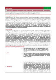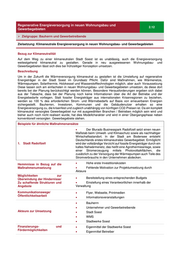 Regenerative Energieversorgung in neuen Wohnungsbau und 2.12 Gewerbegebieten Zielgruppe: Bauherrn und Gewerbetreibende Zielsetzung: Klimaneutrale Energieversorgung in neuen Wohnungsbau- und Gewerbegebieten Bezug zur Klimaneutralität Auf dem Weg zu einer klimaneutralen Stadt Soest ist es unablässig, auch die Energieversorgung weitestgehend klimaneutral zu gestalten. Gerade in neu ausgewiesenen Wohnungsbau- und Gewerbegebieten lässt sich dies bei frühzeitiger Konzeption umsetzen. Beschreibung Um in der Zukunft die Wärmeversorgung klimaneutral zu gestalten ist die Umstellung auf regenerative Energieträger in der Stadt Soest im Grundsatz Pflicht. Dafür sind Maßnahmen, wie Wärmenetze, Wärmepumpen, Solarthermie, Holzkessel und Wasserstofftechnologien möglich, aber auch Voraussetzung Diese lassen sich am einfachsten in neuen Wohnungsbau- und Gewerbegebieten umsetzen, da diese dort bereits bei der Planung berücksichtigt werden können. Besondere Herausforderungen ergeben sich dabei aus der Tatsache, dass bei der Planung noch keine Informationen über die Art der Betriebe und der Energiebedarfe vorliegen. Statt fossiler Energieträger aus internationalen Krisenregionen zu beziehen, werden so 100 % des erforderlichen Strom- und Wärmebedarfs auf Basis von erneuerbaren Energien sichergestellt. Bauherren, Investoren, Kommunen und die Gebäudenutzer erhalten so eine Energieversorgung zu, die krisenfest und zugleich unabhängig von künftigen CO2-Preisen ist. Da ein komplett klimaneutral versorgtes Gewerbegebiet nur mit ausgewählten Branchen / Betrieben möglich sein wird und bisher auch noch nicht realisert wurde, hat dies Modellcharakter und wird in einer Übergangsphase neben konventionell versorgten Gewerbegebiete stehen. Beispiele für ähnliche Maßnahmenansätze Der Blurado Businesspark Radolfzell setzt einen neuen Maßstab beim Umwelt- und Klimaschutz sowie als nachhaltiger Wirtschaftsstandort. In der Stadt am Bodensee entsteht Deutschlands erstes klimaneutrales Gewerbegebiet. Ermöglicht 1. Stadt Radolfzell wird der vollständige Verzicht auf fossile Energieträger durch ein kaltes Nahwärmenetz, das heißt eine Agrothermieanlage, sowie einer Stromerzeugung mittels Photovoltaikflächen, die zusätzlich zu der Versorgung der Wärmepumpen auch Teile des Stromverbrauchs in den Unternehmen abdecken. Hemmnisse in Bezug auf die Hohe erste Investitionskosten Maßnahmenumsetzung Fehlende Motivation zur Projektumsetzung durch Akteure Möglichkeiten zur Überwindung der Hindernisse/ Bereitstellung eines entsprechenden Budgets Zu schaffende Strukturen und Einstellung eines Verantwortlichen innerhalb der Angebote Verwaltung Kommunikationswege/ Flyer, Webseite, Printmedien Öffentlichkeitsarbeit Informationsveranstaltungen Bauherrn Unternehmer und Gewerbetreibende Akteure zur Umsetzung Stadt Soest WMS Stadtwerke Soest Finanzierungs- und Eigenmittel der Stadtwerke Soest Fördermöglichkeiten Eigenmittel Betreiber