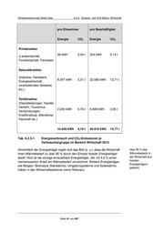 Klimaschutzkonzept Stadt Uslar 6.2.3 Energie- und CO2-Bilanz: Wirtschaft pro Einwohner pro Beschäftigten Energie CO2 Energie CO2 Primärsektor 58 kWh 0,04 t 224 kWh 0,14 t (Landwirtschaft, Forstwirtschaft, Fischerei) Sekundärsektor (Industrie, Handwerk, 8.347 kWh 3,31 t 32.085 kWh 12,71 t Energiewirtschaft, verarbeitendes Gewerbe etc.) Tertiärsektor (Dienstleistungen: Handel, Verkehr, Tourismus, 2.240 kWh 0,76 t 8.609 kWh 2,93 t Versicherungen, Kreditinstitute, öffentlicher Haushalt etc.) 10.645 kWh 4,10 t 40.919 kWh 15,77 t Tab. 6.2.3-1 Energieverbrauch und CO2-Emissionen je Verbrauchergruppe im Bereich Wirtschaft 2013 Hinsichtlich der Energieträger ergibt sich das Bild (s. u.), dass die Wirtschaft über 95 % des ihren Wärmebedarf zu über 95 % durch den Einsatz fossiler Energieträger Wärmebedarfs in deckt. Holz ist der einzige erneuerbare Energieträger, der mit 4,5 % einen der Wirtschaft aus nennenswerten Anteil am Wärmebedarf verzeichnet. Weitere Energieträger, fossilen Energieträgern wie Biogas-/ Biomasse (Nahwärme), Umgebungswärme und Solarwärme, gedeckt haben in den Wirtschaftssektoren keine Relevanz. Seite 41 von 407