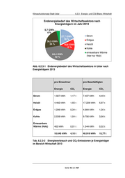 Klimaschutzkonzept Stadt Uslar 6.2.4 Energie- und CO2-Bilanz: Private Haushalte 6.2.4 Energie- und CO2-Bilanz: Private Haushalte Im Jahr 2013 setzten die Privathaushalte in Uslar ca. 122 GWh Endenergie um und emittierten dadurch ca. 36.700 t CO2. Der mit Abstand am stärksten Erdgas in privaten genutzte Energieträger ist – obwohl zahlreiche Ortschaften über kein Haushalten Gasnetz verfügen – Erdgas, der auch verantwortlich ist für die meisten CO2- meistgenutzter Emissionen. Neben dem hohen Bedarf an Strom ist auch der Holzbedarf für Wärmeträger – Privathaushalte von Bedeutung, der – eine nachhaltige Waldbewirtschaftung mehr Energie aus vorausgesetzt – annähernd CO2-neutral ist. Dagegen verursacht Heizöl trotz Holz als aus seines deutlich geringeren Anteils an der Deckung des Energiebedarfs Heizöl deutlich höhere CO2-Emissionen. absolut pro Einwohner Energie CO2 Energie CO2 Strom 24 GWh 14.388 t 1.651 kWh 1,00 t Heizöl 37 GWh 11.219 t 2.558 kWh 0,78 t Erdgas 44 GWh 117.476 t 3.040 kWh 0,73 t Nahwärme 2 GWh 103 t 143 kWh 0,01 t Holz 14 GWh 217 t 937 kWh 0,02 t Umgebungswärme 1 GWh 231 t 79 kWh 0,02 t Solarwärme 1 GWh 23 t 66 kWh 0,00 t 122 GWh 36.703 t 8.474 kWh 2,55 t Tab. 6.2.4-1 Energiebedarf und CO2-Emissionen der Haushalte nach Energieträgern 2013 6.2.5 Energie- und CO2-Bilanz: Verkehr Insgesamt wurden 2013 im Verkehrsbereich ca. 112 GWh Endenergie umgesetzt und 31.745 t CO2 emittiert. Der größte Anteil mit ca. 87 % des Energiebedarfs wie auch der Emissionen entfällt auf den motorisierten Individualverkehr (MIV), der restliche Anteil auf den Öffentlichen Personennahverkehr (ÖPNV). Hinweis: In der verkehrlichen Kurzbilanz werden der Straßengüterverkehr, z. B. Liefertransporte für den Handel, sowie Personen- und Güterverkehre mit Schiff, Bahn und Flugzeug nicht erfasst. Daraus resultieren auch die geringen Energie- und Emissionsanteile für Diesel. Seite 43 von 407