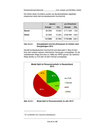 Klimaschutzkonzept Stadt Uslar 6.2.5 Energie- und CO2-Bilanz: Verkehr Die Zahlen dieser Kurzbilanz wurden aus Bundesstatistiken abgeleitet, entsprechen damit dem bundesdeutschen Durchschnitt. absolut pro Einwohner Energie CO2 Energie CO2 Benzin 68 GWh 19.509 t 4.711 kWh 1,36 t Diesel 44 GWh 12.236 t 3.008 kWh 0,85 t 112 GWh 31.745 t 7.719 kWh 2,21 t Tab. 6.2.5-1 Energiebedarf und CO2-Emissionen im Verkehr nach Energieträgern 2013 Gemäß bundesdeutschem Durchschnitt wird etwa jeder 2. Weg mit dem Auto oder anderen eigenen motorisierten Fahrzeugen zurückgelegt. Für die verbleibenden Wege wird etwa zur Hälfte der ÖPNV genutzt, die restlichen Wege werden zu Fuß oder mit dem Fahrrad zurückgelegt. Modal Split im Personenverkehr in Deutschland 2013 12 % 22 % zu Fuß Fahrrad 13 % MIV 53 % ÖPNV 1 Abb. 6.2.5-1 Modal Split im Personenverkehr im Jahr 2013 1 KIT und BMVBS, 2015: Deutsches Mobilitätspanel Seite 44 von 407