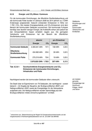 Klimaschutzkonzept Stadt Uslar 6.2.6 Energie- und CO2-Bilanz: Kommune 6.2.6 Energie- und CO2-Bilanz: Kommune Für die kommunalen Einrichtungen, die öffentliche Straßenbeleuchtung und die kommunale Flotte wurden im Zeitraum 2008 bis 2014 jährlich ca. 3 GWh Städtische Endenergie aufgewendet. Dadurch entstanden Emissionen in Höhe von Einrichtungen sind 1.700 t CO2. Die meisten Energieaufwände und CO2-Emissionen sind dem größten Bereich der kommunalen Gebäude zuzurechnen. Der kommunale Fuhrpark kommunalen benötigt zwar deutlich weniger Energie, die Kraftstoffe wirken sich jedoch bei Verbraucher und den klimaschädlichen Gasen erheblich negativ aus. Die geringsten Emittenten. Verbräuche und Emissionen hat der Bereich der öffentlichen Straßenbeleuchtung. absolut pro Einwohner Energie CO2 Energie CO2 Kommunale Gebäude 2.265.641 kWh 747 t 158 kWh 0,05 t Öffentliche 434.960 kWh 254 t 30 kWh 0,02 t Straßenbeleuchtung Kommunale Flotte 270.219 kWh 704 t 19 kWh 0,05 t 2.970.820 GWh 1.705 t 207 kWh 0,12 t Tab. 6.2.6-1 Durchschnittliche Energieverbräuche und CO2- Emissionen der kommunalen Einrichtungen, Infrastruktur und Flotte Nachfolgend werden die kommunalen Gebäude näher untersucht. am meisten genutzte Die Stadt Uslar ist Eigentümerin von 78 Gebäuden, die nachfolgend – soweit Energieträger der Kommune: bekannt – mit Angabe der Baujahre, der Bruttogrundflächen (BGF) und Erdgas, Heizöl Nettogrundflächen (NGF) sowie der Energieträger für die Heizsysteme und Strom aufgelistet sind. Die Nettogrundflächen wurden überschlägig aus den 1 Bruttogrundflächen mittels Umrechnungsfaktoren ermittelt. 1 entnommen aus: „Bekanntmachung der Regeln für Energieverbrauchskennwerte und der Vergleichswerte im Nichtwohngebäudebestand vom 30. Juli 2009“ des BMVBS Seite 45 von 407