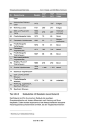Klimaschutzkonzept Stadt Uslar 6.2.6 Energie- und CO2-Bilanz: Kommune BGF NGF Heizenergie- Nr. Bezeichnung Baujahr [m²] [m²] träger Uslar Historisches Rathaus 1 63 1476 700 Erdgas Uslar 64 Wohnhaus Uslar 1751 290 247 Erdgas DGA und Feuerwehr 1960, Holzhack- 65 276 237 Vahle 1996 schnitzel 66 Friedhofskapelle Vahle 1970 79 69 Strom Biogas- 67 Feuerwehr Verliehausen 1960 90 77 Nahwärme Friedhofskapelle 68 1970 70 61 Strom Verliehausen Feuerwehr 69 1973 365 314 Heizöl Volpriehausen Friedhofskapelle 70 1967 98 85 Strom Volpriehausen Mehrzweckgebäude 71 Volpriehausen Bergbau Museum 72 1889 245 213 Strom Volpriehausen 1954, 73 Schule Volpriehausen 1.448 1.303 Heizöl 1906 74 Backhaus Volpriehausen DGA und Feuerwehr 75 Wiensen Friedhofskapelle 76 1373 76 66 unbeheizt Wiensen Wohnung, Jugendraum, 77 Sportraum Wiensen 78 Sportheim Wiensen Tab. 6.2.6-2 Gebäudeliste mit Basisdaten (soweit bekannt) Nachfolgend sind für die einzelnen Gebäude die jeweiligen Energieverbräuche und -kosten differenziert nach Heizung und Strom dargestellt. Zudem wurden ergänzend auf die Nettogrundflächen bezogene Heizenergieverbrauchskennwerte ermittelt, die den Vergleichskennwerten 1 Abschätzung lt. Gebäudebeschreibung Seite 49 von 407