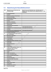Offen Anlagen A1-831/0-4000 GNr Bezeichnung der Merkmale bzw. Bezeichnung der Merkmale bzw. Veränderungen im Veränderungen Rahmen der wehrmedizinischen Begutachtung (u. a. DU- Verfahren) 41 Schultergürtel 42 Wirbelsäule 43 Brustkorb 44 Lunge und Mediastinum 45 Allergien an Haut und Schleimhäuten 46 Herz-Kreislauf-System 47 Beckengürtel 48 Bauchwand- und Zwerchfellbruch 49 Verdauungssystem 50 Analregion und Enddarm 51 Nieren und Harnwege Veränderungen im Urogenitalbereich 52 Nebenhoden Veränderungen im Urogenitalbereich 53 Äußeres Genitale männlich Veränderungen im Urogenitalbereich ! 54 Hoden st Veränderungen im Urogenitalbereich en 55 Prostata Veränderungen im Urogenitalbereich sd 56 Derzeit nicht belegt i ng 57 Arm/Hand ru 58 Bein/Fuß de 59 Gelenke Än 60 Schlüsselbein m 61 Fehlbildungen der Finger de Veränderungen der Finger/Handwurzel 62 Derzeit nicht belegt ht ic 63 Derzeit nicht belegt tn 64 Derzeit nicht belegt eg 65 Derzeit nicht belegt rli te 66 Derzeit nicht belegt un 67 Derzeit nicht belegt k 68 Beindeformierung uc dr 69 Venen us 70 Derzeit nicht belegt rA 71 Fußformveränderung se Veränderungen im Bereich der Füße 72 Derzeit nicht belegt ie Veränderungen im Bereich der Füße 73 Zehen D Veränderungen im Bereich der Füße 74 Derzeit nicht belegt 75 Infektionskrankheiten (auch Tropenkrankheiten und Parasitosen) 76 Fremdkörper 77 Zerebrale Anfälle Veränderungen im Bereich des zentralen Nervensystems 78 Zentrales Nervensystem Veränderungen im Bereich des zentralen Nervensystems 79 Peripheres Nervensystem/neuromuskuläre Erkrankungen/Schmerzsyndrome 80 Impfreaktionen 81 Gynäkologische Erkrankungen und Folgeerscheinungen 82 Endokrine Drüsen 83 Unberücksichtigte Auffälligkeiten Tabelle der Bezeichnung der Gesundheitsnummern Seite 191 Stand Juli 2021