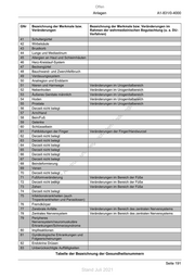 Offen A1-831/0-4000 Anlagen 7.8.1 Gesundheitsziffern und deren ausgeschlossene Verwendungen GZr Ausgeschlossene Verwendung (VerwBer) Gültig ab 01.04.2021 II 1 (1) Keine Verwendung ausgeschlossen II 1 (2) Z329 II 1 (3) Z329 II 2 (1) Keine Verwendung ausgeschlossen II 2 (2) Keine Verwendung ausgeschlossen II 2 (3) Keine Verwendung ausgeschlossen II 2 (4) Keine Verwendung ausgeschlossen II 12 Keine Verwendung ausgeschlossen II 13 Keine Verwendung ausgeschlossen II 15 Keine Verwendung ausgeschlossen ! st II 18 Z322, Z328, Z329, Z331, Z381, Z393, Z593, Z793 en sd i II 20 Keine Verwendung ausgeschlossen ng II 21 Keine Verwendung ausgeschlossen ru de II 22 (1) Keine Verwendung ausgeschlossen Än II 22 (2) Z353, Z511, Z750 m de II 24 (1) Z310, Z353, Z511, Z750 ht II 24 (2) Z353, Z511, Z750 tn ic II 25 Z353, Z511, Z750 eg rli II 26 (1) Z700, Z750, Z790, Z793, Z795 te II 26 (2) un Z700, Z750, Z790, Z793, Z795 k II 26 (3) uc Keine Verwendung ausgeschlossen dr II 28 Keine Verwendung ausgeschlossen us II 29 rA Keine Verwendung ausgeschlossen se II 37 Keine Verwendung ausgeschlossen ie D II 38 Keine Verwendung ausgeschlossen II 45 Keine Verwendung ausgeschlossen II 46 Keine Verwendung ausgeschlossen II 49 Keine Verwendung ausgeschlossen II 61 Keine Verwendung ausgeschlossen II 79 Keine Verwendung ausgeschlossen II 80 Keine Verwendung ausgeschlossen II 83 Keine Verwendung ausgeschlossen III 1 (1) Z322, Z328, Z329, Z331, Z341, Z381, Z382, Z581, Z700, Z750, Z790, Z793, Z795 III 1 (2) Z322, Z328, Z329, Z331, Z341, Z381, Z581 III 1 (3) Z322, Z328, Z329, Z331, Z341, Z381, Z581, Z700, Z750, Z790, Z793, Z795 III 1 (4) Z322, Z328, Z329, Z331, Z341, Z381, Z581, Z700, Z750, Z790, Z793, Z795 Seite 196 Stand Juli 2021
