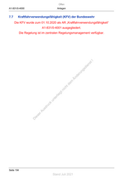 Offen A1-831/0-4000 Anlagen 7.7 Kraftfahrverwendungsfähigkeit (KFV) der Bundeswehr Die KFV wurde zum 01.10.2020 als AR „Kraftfahrverwendungsfähigkeit“ A1-831/0-4001 ausgegliedert. Die Regelung ist im zentralen Regelungsmanagement verfügbar. ! st en sd i ng ru de Än m de ht ic tn eg rli te un k uc dr us rA se ie D Seite 194 Stand Juli 2021