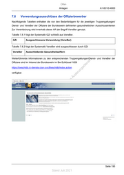 Offen Anlagen A1-831/0-4000 7.8 Verwendungsausschlüsse der Offizierbewerber Nachfolgende Tabellen enthalten die von den Bedarfsträgern für die jeweiligen Truppengattungen/ Dienst- und VerwBer der Offiziere der Bundeswehr definierten gesundheitlichen Ausschlusskriterien Zur Vereinfachung wird innerhalb dieser AR der Begriff VerwBer genutzt. Tabelle 7.8.1 folgt der Systematik GZr schließt aus VerwBer. GZr Ausgeschlossene Verwendung (VerwBer) Tabelle 7.8.2 folgt der Systematik VerwBer wird ausgeschlossen durch GZr VerwBer Ausschließende Gesundheitsziffern Weiterführende Informationen zu den entsprechenden Truppengattungen/Dienst- und VerwBer der ! Offiziere sind im Intranet der Bundeswehr im Bw-Schlüssel 1659 st en sd https://bwschldb.rz-dienste.rzsrv.svc/Bwschldb/index.action i ng verfügbar. ru de Än m de ht ic tn eg rli te un k uc dr us rA se ie D Seite 195 Stand Juli 2021