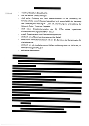 - erstellt und setzt um Einsatzbefehle - hält vor aktuelle Einsatzunterlagen - stellt sicher Erstellung von Foto-/ Videoaufnahmen für die Darstellung des Einsatzverlaufs ausschnittsweise tagesaktuell und gesamtheitlich im Nachgang des Einsatzes gem. Weisung EA- Leiter auf Anforderung und Unterstützung der UA durch DOKu.-Trupp und Fotografen - stellt sicher Einsatzdokumentation des EA EPÖA mittels it-gestütztem Ejnsatzprotokollierungssystem BAO - Modul - erstellt Einsatzverlaufs-und Einsatzerfahrungsberichte - stellt sich ein auf Beschwerdemanagement bei Bedarf - stellt sicher lnformationsaustausch mit den öA-Bereichen der benachbarten si- cherheitspartner - stellt sich ein aufAusgliederung von Kräften zur Bildung eines uA EPÖAfür pa- rallele BAO-Lagen BPOLD H - stelltsicherMeldewesen __