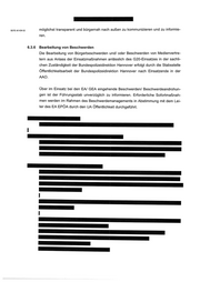 möglichst transparent und bürgernah nach außen zu kommunizieren und zu informie- ren. 6.3.6 Bearbeitung von Beschwerden Die Bearbeitung von Bürgerbeschwerden und/ oder Beschwerden von Medienvertre- tern aus Anlass der Einsatzmaßnahmen anlässlich des G20-Einsatzes in der sachli- chen Zuständigkeit der Bundespolizeidirektion Hannover erfolgt durch die Stabsstelle Öffentlichkeitsarbeit der Bundespolizeidirektion Hannover nach Einsatzende in der AAO. Über im Einsatz bei den EA/ GEA eingehende Beschwerden/ Beschwerdeandrohun- gen ist der Führungsstab unverzüglich zu informieren. Erforderliche Sofortmaßnah- men werden im Rahmen des Beschwerdemanagements in Abstimmung mit dem Lei- ter des EA EPÖA durch den UA Öffentlichkeit durchgeführi.
