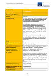 Integriertes Klimaschutzkonzept der Stadt Freising Handlungsfeld A – Akteurs- und Bürgerbeteiligung A 3 – Wettbewerb Maßnahmen-Nr. A 3.3 Bezeichnung der Maßnahme Grüne Hausnummern Priorität 2 – 5 Jahre Kurzbeschreibung "Die Grüne Hausnummer" ist ein Gütesiegel für nachhaltig und umweltfreundlich gebaute und betriebene Gebäude. Die Hausnummer wird öffentlichkeitswirksam an die ausgezeichneten Gebäude angebracht. Die Bewertung der Häuser erfolgt nach einem Punkte- system, welches in die Bereiche Energieeffizienz, Gebäude, Heizung, Wasser, Naturschutz und Umwelt- projekte unterteilt ist. Die Punkte ergänzen sich in einem Bewertungssystem. Ab einer Gesamtpunktzahl von 100 Punkten erhält der Gebäudeeigentümer das Gütesiegel. Jeder Hasubesitzer der Stadt Freising kann sich um die "Grüne Hausnummer" bewerben. Der teilnehmende Gebäudebesitzer weist die in seinem Gebäude umgesetzten Maßnahmen über Rechnungen (z.B. zu Baumaterial, Bauprodukte, Heizungsanlage), den Energiebedarfsausweis und ergänzende Fotodokumen- tationen nach. Status neu Begleitende und flankierende A 2.1 Entwicklung einer Datenbank mit erfolgreichen Bei- Maßnahmen spielen der Gebäudesanierung Koordinierende / organisierende Stadt Freising als zertifizierende Organisation in Kooperati- Akteure (Zuständigkeit) on mit Lokale Agenda 21, Freisinger Energielokal Adressat der Maßnahme Eigentümer von Gebäuden in der Stadt Freising Aufwand / Kosten Gesamt Abhängig von der Zahl der Antragsteller (in T Euro/a) Es sind zehn Bewertungskriterien zu prüfen, wobei die Teil- nehmenden auf standardisiert vorgegebenen Fragebögen die Bewertung zunächst selbst dokumentieren und mit den geforderten Dokumentationen belegen. Pro Antragsteller ist für die Prüfung auf Vergabe der "Grünen Hausnummer" ein durchschnittlicher Zeitaufwand von drei Stunden anzuset- zen. 2013-2015 n.a. Jährliche Energieeinsparung nicht quantifizierbar Jährliche CO2-Einsparung (ab 2020 nicht quantifizierbar gemäß Zielszenario) Fördermöglichkeiten n.a. 184