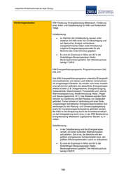 Integriertes Klimaschutzkonzept der Stadt Freising Fördermöglichkeiten KfW-Förderung "Energieberatung Mittelstand", Förderung einer Initial- und Detailberatung für KMU und freiberuflich Tätige Initialberatung Im Rahmen der Initialberatung werden unter anderem mit Hilfe einer Vor-Ort-Besichtigung und auf Basis einer Analyse vorhandener energietechnischer Daten erste Hinweise auf mögliche Energieeinsparpotenziale für alle Bereiche des Unternehmens gegeben. Es wird ein Zuschuss in Höhe von 80 % der förderfähigen Beratungskosten (Netto- Beratungshonorar) gewährt. Der Höchstzuschuss beträgt 1.280 €. KfW-Energieeffizienzprogramm, Programmnummern 242, 243, 244 Das KfW-Energieeffizienzprogramm unterstützt Energieeffi- zienzmaßnahmen von kleinen und mittleren Unternehmen mit zinsgünstigen Darlehen. Es werden zum einen Investiti- onsmaßnahmen gefördert, die wesentliche Energieeinspar- effekte erzielen (z.B. Anlagentechnik, Energieerzeugung, Gebäudehülle, Maschinenpark, Prozesskälte und -wärme, Wärmerückgewinnung, Abwärmenutzung, Mess-, Regel- und Steuerungstechnik, IKT). Des Weiteren werden Maß- nahmen zur Sanierung und dem Neubau von Gebäuden gefördert. Ferner können in Verbindung mit einer förde- rungswürdigen betrieblichen Energieeinsparinvestition Auf- wendungen für die Planung- und Umsetzungsbegleitung sowie für Energiemanagementsysteme gefördert werden. Bei KMU ist die Einsparung durch die Investitionsmaßnah- me bei Antragstellung durch einen in der KfW-Beraterbörse Energieberatung Mittelstand zugelassenen Berater zu er- mitteln. Detailberatung In der Detailberatung wird die Energieanalyse vertieft, um einen konkreten Maßnahmenplan aufzustellen. Ziel ist es, die Bereiche mit den größten energetischen Schwachstellen bzw. den größten Effizienzpotenzialen zuerst zu analysieren. Es wird ein Zuschuss in Höhe von 60 % der förderfähigen Beratungskosten (Netto- Beratungshonorar) gewährt. Der Höchstzuschuss beträgt 4.800 €. 186