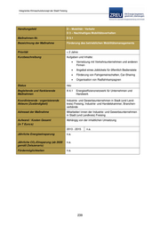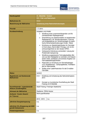 Integriertes Klimaschutzkonzept der Stadt Freising Handlungsfeld D – Mobilität / Verkehr D 2 – Fuß- und Radverkehr Maßnahmen-Nr. D 2.2 Bezeichnung der Maßnahme Umsetzung eines Radverkehrskonzepts Priorität < 2 Jahre Kurzbeschreibung Aufgaben und Inhalte: Schaffung eines zusammenhängenden und flä- chendeckenden Radwegenetzes Entschärfung von Gefahrenstellen im bestehenden Radwegenetz (z.B. Schülerradverkehr), Führung und Ausgestaltung von Verkehrsanlagen für spezi- fische Sicherheitsanforderungen Kinder / Ältere Errichtung von Abstellmöglichkeiten für Fahrräder in Form eines „Park & Bike“-Prinzips, z.B. mit An- schlussmöglichkeit an den lokalen ÖPNV, Verbesserte Anbindung Lerchenfeld / Lösung der Problematik Isarquerung Schaffung ausgewiesener Fahrradparkplätze (Bo- xen) auf dem Stadtgebiet an zentralen und frequen- tierten Orten, sichtbares und sicheres Angebot von Fahrradabstellmöglichkeiten Potenziale zur Errichtung von Schnellradwegen (z.B. Hauptbahnhof - Campusgelände), Vorbildpro- jekt für Nahmobilität Aufbau einer Ladeinfrastruktur für die E-mobilen Fahrräder Status laufend Begleitende und flankierende D 0.1 Erstellung und Umsetzung des Nahverkehrsplans Maßnahmen 2014 D 2.1 Konzept zur touristischen Erschließung der Stadt Freising mit E-Mobilität Koordinierende / organisierende Stadt Freising, Freisinger Stadtwerke Akteure (Zuständigkeit) Adressat der Maßnahme Radfahrer, ÖPNV-Nutzer Aufwand / Kosten Gesamt Nicht quantifizierbar (in T Euro/a) 2013 - 2015 n.a. Jährliche Energieeinsparung n.a. Jährliche CO2-Einsparung (ab 2020 n.a. gemäß Zielszenario) Fördermöglichkeiten n.a. 237