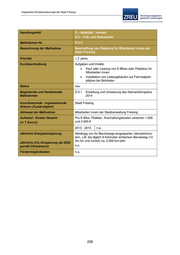 Integriertes Klimaschutzkonzept der Stadt Freising Handlungsfeld D – Mobilität / Verkehr D 2 – Fuß- und Radverkehr Maßnahmen-Nr. D 2.3 Bezeichnung der Maßnahme Beschaffung von Pedelecs für Mitarbeiter/-innen der Stadt Freising Priorität < 2 Jahre Kurzbeschreibung Aufgaben und Inhalte: Kauf oder Leasing von E-Bikes oder Pedelecs für Mitarbeiter/-innen Installation von Ladezapfsäulen auf Fahrradpark- plätzen bei Behörden Status neu Begleitende und flankierende D 0.1 Erstellung und Umsetzung des Nahverkehrsplans Maßnahmen 2014 Koordinierende / organisierende Stadt Freising Akteure (Zuständigkeit) Adressat der Maßnahme Mitarbeiter/-innen der Stadtverwaltung Freising Aufwand / Kosten Gesamt Pro E-Bike, Pedelec: Anschaffungskosten zwischen 1.500 (in T Euro/a) und 2.000 € 2013 - 2015 n.a. Jährliche Energieeinsparung Abhängig von für Berufswege eingesparten Jahreskilome- tern, z.B. bei täglich 6 Kilometer einfachem Berufsweg (12 km hin und zurück) ca. 2.000 km/Jahr Jährliche CO2-Einsparung (ab 2020 gemäß Zielszenario) s.o. Fördermöglichkeiten n.a. 238