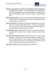 Integriertes Klimaschutzkonzept der Stadt Freising Steinbeis Forschungsinstitut für solare und zukunftsfähige thermische Energiesyste- me (2008): Solare Nahwärme und Langzeit-Wärmespeicher. Wissenschaftlich- technische Programmbegleitung für Solarthermie2000plus. Forschungsbericht zum BMU-Vorhaben 0329607L. Autoren: D. Mangold, M. Riegger, T. Schmidt, Stuttgart: 2008. Süddeutsche Zeitung 2013: Invasion der Verbrauchszwerge. Der oftmals totgesagte Diesel ist lebendiger denn je: VW kündigt Dreizylinder mit 100 kW Literleistung an. Süddeut- sche Zeitung vom 16. Juni 2013, S. 42. Team für Technik (2011): Erstellung eines ganzheitlichen Energiekonzepts für die Liegen- schaften der Hochschulen Weihenstephan, Phase V - Umsetzungs- und Gesamtkon- zept. Konzept erstellt im Auftrag des Wissenschaftszentrums Weihenstephan, Um- welt- und Ressourcenmanagement, Datum: 07. April 2011. Umweltbundesamt (2010): Energieziel 2050: 100% Strom aus erneuerbaren Quellen, Her- ausgeber: Klaus T., Vollmer C. Werner, K. Lehmann H., Müschen K. Dessau/Roßlau: Juli 2010. Zeitung für Kommunalwirtschaft (2012): Kooperationen, wo sie Sinn machen. Freisinger Stadtwerke: Im prosperierenden Münchner Umland arbeitet das vollständig kommu- nale Querverbundunternehmen an neuen Konzepten. Der Regionalversorger punktet mit atomkraftfreiem Strom sowie Wind- und Solarprojekten. Wechselquote von ledig- lich 7%. In: Zeitung für Kommunalwirtschaft, April 2012, Seite 18. ZREU (2012): Energiebericht der Stadt Freising. Regensburg: Monat 2012. 247
