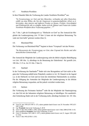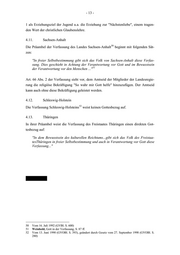 - 12 - 4.7. Nordrhein-Westfalen 44 In ihrer Präambel führt die Verfassung des Landes Nordrhein-Westfalen aus: "In Verantwortung vor Gott und den Menschen, verbunden mit allen Deutschen, erfüllt von dem Willen, die Not der Gegenwart in gemeinschaftlicher Arbeit zu ü- berwinden, dem inneren und äußeren Frieden zu dienen, Freiheit, Gerechtigkeit und Wohlstand für alle zu schaffen, haben sich die Männer und Frauen des Landes 45 Nordrhein-Westfalen diese Verfassung gegeben:..." Art. 7 Abs. 1 gibt als Erziehungsziel u.a. "Ehrfurcht vor Gott" an. Der Amtseid der Mit- glieder der Landesregierung (Art. 53 Satz 1) kann mit der religiösen Beteuerung "So wahr mir Gott helfe" geleistet werden (Satz 2). 4.8. Rheinland-Pfalz 46 Die Verfassung von Rheinland-Pfalz beginnt in ihrem "Vorspruch" mit den Worten: "Im Bewusstsein der Verantwortung vor Gott, dem Urgrund des Rechts und aller 47 menschlichen Gemeinschaft, ..." Der Amtseid der Mitglieder der Landesregierung sieht die üblich religiöse Bekräftigung vor (Art. 100 Abs. 1), allerdings ist die Benutzung der Eidesformel frei gestellt (Art. 100 Abs. 2 i.V.m. Art. 81 Abs. 3 Satz 2). 4.9. Saarland 48 In der Verfassung des Saarlandes findet sich eine Bezugnahme auf Gott nicht zu Be- ginn (die Verfassung enthält keine Präambel), sondern in Art. 30. Danach ist die Jugend u.a. in der Ehrfurcht vor Gott und im Geist der christlichen Nächstenliebe zu erziehen. Für die Ablegung des Amtseides der Mitglieder der Landesregierung ist die übliche religiöse Beteuerung vorgesehen, auf die jedoch verzichtet werden kann. 4.10. Sachsen 49 Die Verfassung des Freistaates Sachsen sieht für die Mitglieder der Staatsregierung vor, den Eid mit der bekannten religiösen Beteuerung zu bekräftigen. Ein ausdrückli- cher Gottesbezug findet sich in der Verfassung nicht, allerdings bestimmt Art. 101 Abs. 44 Vom 28. Juni 1950 (GV-NW S. 127), zuletzt geändert durch Gesetz vom 24. November 1992 (GV- NW S. 448) 45 Vgl. Weinhold, Gott in der Verfassung, S. 49 ff. 46 Vom 18. Mai 1947 (VOBl. S. 209), zuletzt geändert durch Gesetz vom 8. März 2000 (GVBl. S. 65) 47 Dazu ausführlich Weinhold, Gott in der Verfassung, S. 44 ff. 48 Vom 15. Dezember 1947 (ABl. S. 1077), zuletzt geändert durch Gesetz vom 25. August 1999 (ABl. S. 1318) 49 Vom 27. Mai 1992 (GVBl. S. 243)