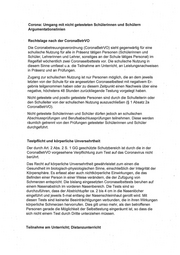 Corona: Umgang mit nicht getesteten Schülerinnen und Schülern Argumentationslinien Rechtslage nach der CoronaBetrVO Die Coronabetreuungsverordnung (CoronaBetrVO) sieht gegenwärtig für eine schulische Nutzung für alle in Präsenz tätigen Personen (Schülerinnen und Schüler, Lehrerinnen und Lehrer, sonstiges an der Schule tätiges Personal) im Regelfall wöchentlich zwei Coronaselbsttests vor. Die schulische Nutzung in diesem Sinne umfasst u.a. die Teilnahme am Unterricht, an Leistungsnaniweisen in Präsenz und an Prüfungen. Zugang zur schulischen Nutzung ist nur Personen möglich, die an dem jeweils letzten von der Schule für sie angesetzten Coronaselbsttest mit negativem Er- gebnis teilgenommen haben oder zu diesem Zeitpunkt einen Nachweis über eine negative, höchstens 438 Stunden zurückliegende Testung vorgelegt haben. Nicht getestete und positiv getestete Personen sind durch die Schulleiterin oder den Schulleiter von der schulischen Nutzung auszuschlieiten (8 1 Absatz 2a CoronaBetrVO). Nicht getestete Schülerinnen und Schüler dürfen jedoch an schulischen Abschlussprüfungen und Berufsabschlussprüfungen teilnehmen. Diese werden räumlich getrennt von den Prüfungen getesteter Schülerinnen und Schüler durchgeführt. Testpflicht und körperliche Unversehrtheit Der durch Art. 2 Abs. 2 S. 1 GG geschützte Schutzbereich ist durch die in der CoronaBetrVO vorgesehene Verpflichtung zum Test auf das Coronavirus nicht berührt. Das Recht auf körperliche Unversehrtheit gewährleistet zum einen die Gesundheit im biologisch-physiologischen Sinne, einschließlich der Integrität der Körpersphäre. Es erfasst aber auch nichtkörperliche Einwirkungen, die das Befinden einer Person in einer Weise verändern, die der Zufügung von Schmerzen entspricht. Die bislang eingesetzten Coronaselbsttests beruhen auf einem Nasenabstrich im vorderen Nasenbereich. Die Tests sind so durchzuführen, dass der Abstrichtupfer ca. 2 bis 4 cm in die Nasenlöcher eingeführt und jeweils 5-mal entlang der Nasenschleimhaut gerollt wird. Mit ' diesen Tests sind keinerlei Beeinträchtigungen verbunden, die in ihren Wirkungen körperliche Schmerzen hervorrufen. Dies gilt umso mehr, als den betroffenen Personen gerade die Möglichkeit der Selbsttestung eingeräumt ist, so dass die sich nicht einem Test durch Dritte unterziehen müssen. Teilnahme am Unterricht; Distanzunterricht