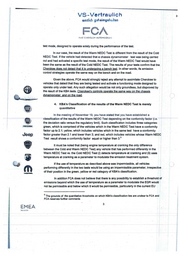 VS - Vertraulich 2: amtlich ·gaheimgeholten f'lt\T Cl1HYSLER AUTO MOB ILE- S- test mode, designed to operate solely during the performance of the test. In our case, .the result of the Warm NEDC Test is different from the result of the Cold NEDC Test. lf the vehicle had detected that a chassis dynamometer test was being carried out and had activated a specific test mode, the result of the Warm NEDC Test would have been the same as the result ofthe Cold NEDC Test. The results ofyour tests confirm that the Cherokee does not detect that it is under9oinq a bench test. In other words, its emission control strategies operate the same way on the bench and on the road. . Given the above, FCA would sfrongly reject any attempt to assimilate Cherokee to vehicles that detect that they are being tested and activate a functioning mode designed to 1 . 9 .· . . ..... , 1 . operaie only under test. Any such allegation would be not only groundless, but disproved by the result ~f the KBA iests. Cherokee's controls operate the same way on the chassis dyriamometer and on the road . 4. KBA's Classlficatlon of the results of the Warm NEDC Test ls merely .G) quantitative · In the meeting of November 19, you have stated that you have established a classification of the·results of the Warm NEDC Test depending on the conformity factor (i.e. -.~ the deviation ratio versus the regulatory limit). Such classification includes three categories: .~ ~- green, which is comprised of the vehicles which in the W_ arm NEDC Test have a conformity factor up to 2.1; yellow, which includes vehicles which in the same test have a conformity Jeep factor greater than 2.1 and lower than 3; and red, which includes vehicles whose Warm NEDS 3 Test result shows a conformity factor equal or higher than 3. i ••• ·~-.::. lt must be noted that (being engine temperature at cranking the only difference between the Cold and Warm NEDC Test) any vehicle that has performed differently in the •m Warm NEDC Test vs. the Cold NEDC Test (i) detects temperature at c~anking and (li) uses · temperature at cranking as a parameter to modulate the emission treatment system. lf the use of temperature as described above was impermissible, all vehicles , performing differently in the two tests wÖuld be using an impermissible parameter, irrespective --· 1 of their position in the green, yellow or red category of KBA's classification. · In addition FCA does not believe that there is any possibility to establish a threshold . i' emissions' be.yond which the use of temperature as a parameter to modulate the EGR would 1 not be per'missible and below which it would be permissible, particularly in the current EU . 1 • 1 j 3 · The grounds of the quantitative thresholds on which KBA's classification lies are undear to FCA and 1 1 . FCA reseives further comments 3, 1 ! EMEA i1 . .1 i 1 I 1