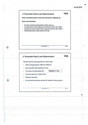 191 14.09.2016 3. Parameter Road Load Determination . VDA Road Load Detennination cont'd (not relevant for Validation 2): Raad Load Evaluation: • One time moderate braking before vehicle warm up • Consideration of rotary masses as described (conform ISO 10521) • Averaging offorces instead oftime segments (conform ISO 10521) • Vehicle coast down mode switched on if any 1 WLTPV■ lidallon 1+ 2 5eite9 C) f i VDA 1 f 3. Parameter Road Load Determination ! ft 1 Vehicle selection and preparation for dyno tests : . :1 J Vehicle mileage between 3000 and 15000 km . Dyno operation mode switched on if any - . Tire pressure during testing TBD 1Setpoint: 3, 1 bar 1 l " ~ . Automatie gearboxes: Default m_ ode ' ' ' . Reference fuel used -·-- - 1 l~ . AC and electrical devices switched oft, Daytime Running Light on i (_) • ' ' 1 V/l TP Vtilidolion 1 • 2 Seile 10 5 /