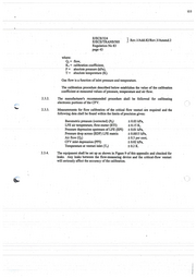 122 E/ECE/324 E/ECE/fRANS/505 } Rev.1/Add.82/Rev.3/Amend.2 Regulation No 83 page 43 where: Q.= flow, Kv = calibration coefficient, P = absoiute pressure (kPa), T = absolute temperature (K). Gas flow is a function of inlet pressure and temperature. The calibration procedure described below establishes the value of the calibration coefficient at measured values of pressure, temperature and air flow. 2.3.2. The manufacturer's recommended .procedure shall be followed for calibrating electronic portions ofthe CFV. 2.3.3. Measurements for flow calibration of the critical flow venturi are required and the following data shall be found within the limits ofprecision given: Barometrie pressure (corrected) (Pb) ±0.03 kPa, LFE air temperature, flow-meter (ETI) ± 0.15 K, Pressure depression upstream of LFE (EPI) ±0.01 kPa, · Pressure drop across (EDP) LFE matrix ± 0.0015 kPa, Air flow (Qs) ± 0.5 per cent, CFV inlet depression (PPI) ±0.02 kPa, Temperature at venturi inlet (Tv) ±0.2K. 2.3.4. Tue equipment shall be set up as shown in Figure 9 of this appendix and checked for leaks. Any leaks between the flow-measuring device and the critical-flow venturi will seriously affect the accura~y of the calibration.