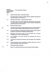 127 E/ECE/324 } Rev.1/Add.82/Rev.3/Amend.2 E/ECEffRANS/505 Regulation No 83 page 48 1.3.2. . Hydrocarbons (HC) analysis - spark-ignition engines: The analyser shall be of the flame ionisation (FID) type calibrated with propane gas expressed equivalent to carbon atoms (C 1). ' .1.3.3 . . Hydrocarbons (HC) analysis - compression-ignition engines: The analyser shall be of the flame ionisation type with detector, valves, pipework, etc., heated to 463 K ( 190 °C) ± l 0 K (HFID). lt shall be calibrated with propane gas expressed equivalent to carbon atoms (C1). 1.3.4. Nitrogen oxide (NOx) analysis: Q The analyser shall be either of the chemi-luminescent (CLA) or of the non-dispersive ultra-violet resonance absorption (NDUVR) type, both with NOx-NO converters. · 1.3.5. The analysers shall have a measuring range compatible with the accuracy required to measure the concentrations ofthe exhaust gas sample pollutants. 1.3.6. Measurement error shall not exceed ± 2 per cent (intrinsic error of analyser) disregarding the true value for the calibration gases. 1.3.7. Fot concentrations of less than 100 ppm; the measurement error shall not exceed ± 2 ppm. 1.3.8. The ambient air sample s.hall be measured on the same analyser with an appropriate range. · 1.3.9. No gas drying device shall be used before the analysers unless shown to have no effect on the pollutant content of the-gas streani. 1.4. Recommended System Descriptions 0 Figure 10 is a schematic drawing of the system for gaseous emissions sampling.