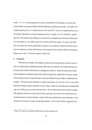 blocks. A 1.1 to 1.5 percentage point increase in probability of subscribing to a service each month implies an expected 44,000 to 60,000 additional subscribers per month. UK Netflix sub- scriptions alone grew by 1.9 million between 2014 and 2015°*, and so our implied increase in to- tal monthly subscribers to all legal streaming services is roughly 2.3-3.1% of Netflix’s growth that year. We interpret these findings as economically meaningful, given that the monthly price ofaa subscription to, say, Netflix in the UK is £6.99 to £9.99 per month. Of course, this result does not account for existing subscription customers who would have otherwise left the service but were retained as a result of the blocks, or the beneficial price elasticity effects of causing ex- isting users to view 7-12% more content on these sites. 6. Discussion While the use of supply side antipiracy actions has increased greatly in recent years as a tool in the fight against intellectual property theft, there are relatively few studies that have em- pirically analyzed their effectiveness in changing user behavior. While the studies that consid- ered the takedown of pirated content found uplifts in legal sales, studies that focused on eutting off or blocking access to content through a dominant channel found no effect on legitimate con- sumption. By analyzing the blocking of a single major piracy site in the UK in 2012, we confirm these prior findings: pirates continued to access illegal content by increasing piracy through other sites or by finding ways to circumvent the blocks. But we demonstrate that the effect of supply- side antipiracy policies are more nuanced when more sites are involved: Our results show that disrupting access to content through a number of the most popular sites causes decreases in over- all piracy and increases in usage of paid legal channels. And we find evidence suggesting that 24 https://www.statista.com/statistics/324092/number-of-netflix-subscribers-uk/ 43