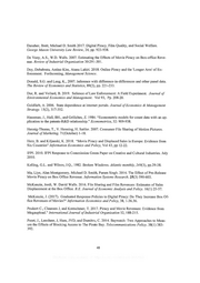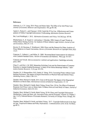 References Adermon, A.,C.Y. Liang. 2014. Piracy and Music Sales: The Effect of an Anti-Piracy Law. Journal of Economics Behavior and Organization. 105, pp 90-106. Aguiar L, Peukert C., and Claussen J. 2018. Catch Me If You Can: Effectiveness and Conse- quences of Online Copyright Enforcement. Forthcoming, Information Systems Research. Bai, J and Waldfogel, J. 2012. Information Economics and Policy, Vol 24(3) pp. 187-96. Bhattacharjee, S., R. Gopal, K. Lertwachara, J. Marsden. 2006. Impact of Legal Threats on Online Music Sharing Activity: An Analysis of Music Industry Legal Actions. Journal of Law and Economics, 49(1) 91-114, Bounie, D., M. Bourreau, P. Waelbroeck. 2006. Piracy and the Demand for Films: Analysis of Piracy Behavior in French Universities. Review of Economic Research on Copyright Issues, 3(2) 15-27. Cameron, C., Gelbach, J., and Miller, D. 2008. Bootstrap-Based Improvements for Inference with Clustered Standard Errors. Review of Economics and Statistics. 90(3), pp. 414-427. Cameron and Trivedi. Microeconometrics: methods and applications. Cambridge university press, 2005. Chen, P., and Hitt, L.M. 2002. Measuring Switching Costs and the Determinants of Customer Retention in Internet-Enabled Businesses: A Study of the Online Brokerage Industry." Infor- mation Systems Research, 13 (3), pp. 255-274. Danaher, B., S. Dhanasobhon, M.D. Smith, R. Telang. 2010. Converting Pirates without Canni- balizing Purchasers: The Impact of Digital Distribution on Physical Sales and Internet Piracy. Marketing Science, 2%6) 1138-1151. Danaher, Brett, Michael D. Smith. 2014. Gone in 60 Seconds: The Impact of the Megaupload Shutdown on Movie Sales. International Journal of Industrial Organization. 33 1-8. Danaher, Brett, Michael D. Smith, Rahul Telang, Siwen Chen. 2014a. The Effect of Graduated Response Anti-Piracy Laws on Music Sales: Evidence from an Event Study in France. Journal of Industrial Economics. 62(3) 541-553. Danaher, Brett, Michael D. Smith, Rahul Telang. 2014b. Piracy and Copyright Enforcement Mechanisms, Lerner and Stern, eds. Innovation Policy and the Economy, Volume 14, Chapter 2 (pp. 31-67), National Bureau of Economic Research, University of Chicago Press, Chicago, Illi- nois. Danaher, Brett, Michael D. Smith, and Rahul Telang. 2017. Copyright Enforcement in the Digi- tal Age: Empirical Evidence and Policy Implications. Communications of the ACM, Vol 60(2), pp 68-75. 47
